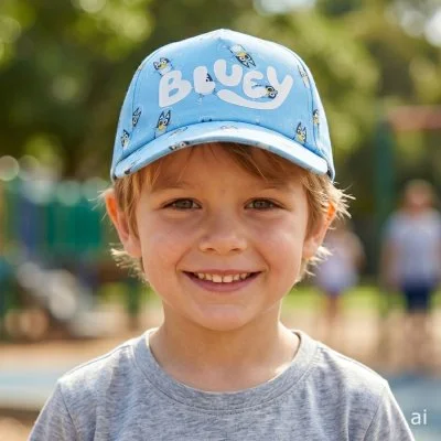 Modrá dětská kšiltovka s motivem Bluey. Nabízíme ji ve velikostech 52 cm nebo 54 cm. Na zadní ...