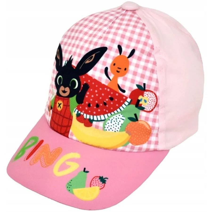 Dívčí baseballová čepice Zajíček Bing. Přední stranu kšiltovky zdobí obrázek zajíčka Binga, jeho pečovatele Flopa a spousta ovoce. Zadní strana čepice a spodní část kšiltu je světle, středně, nebo tmavě růžová - viz výběr barvy a velikosti. Ze zadní strany je nastavovací pásek se suchým zipem. Čepice je vyrobená ze 100% bavlny, materiál obrázkového potisku je 100% polyester.