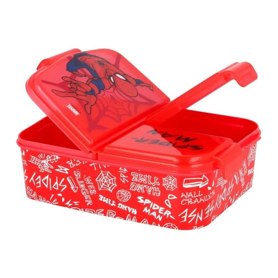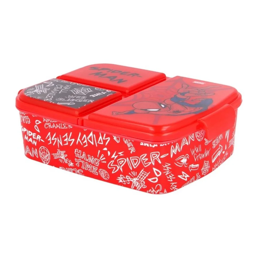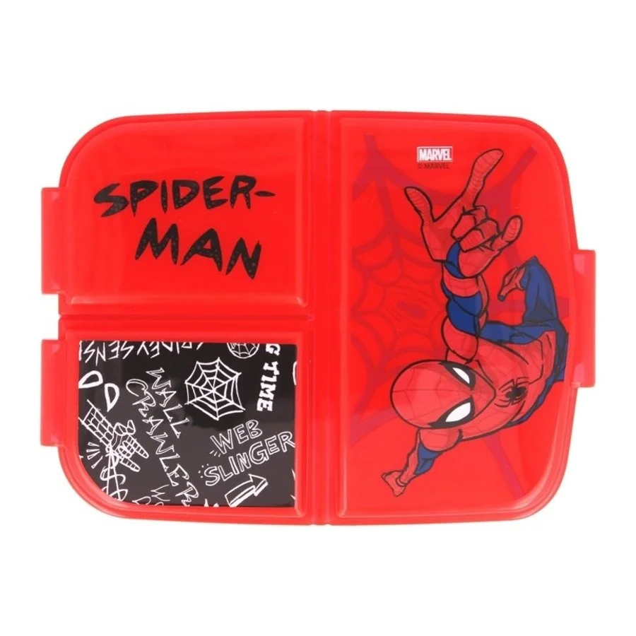 Svačinový multibox Spiderman se třemi přihrádkami. Odolná krabička na svačinu ideální do školy i na cesty a výlety. Víko je částečně průhledné pro snadnější přehled o obsahu boxu a zdobí jej obrázek komiksového a filmového superhrdiny Spidermana. Tato dóza na jídlo, nebo na jiné drobné předměty je vhodná pro děti od 3 let a není vhodná do myčky na nádobí, ani do mikrovlnné trouby. Je vyrobená ze zdravotně nezávadného materiálu bez obsahu BPA. K čištění nepoužívejte abraziva ani detergenty. Rozměry tohoto boxu na svačinu jsou cca 17 x 13,5 x 5,5 cm, jeho hmotnost je 150 gr.