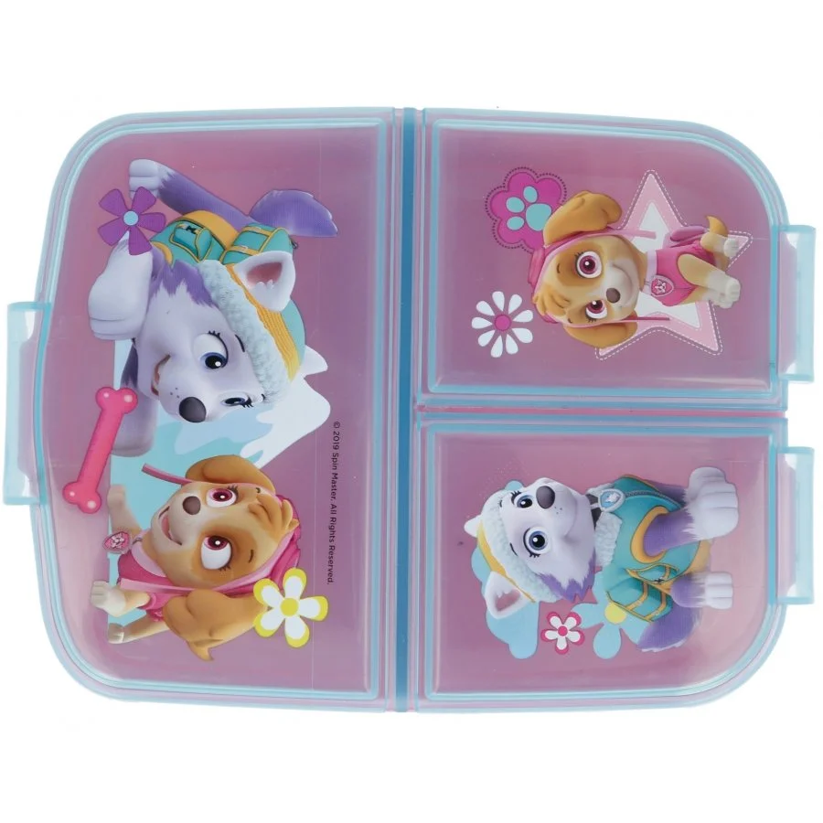Dívčí svačinový multibox Tlapková patrola - Paw Patrol se třemi přihrádkami. Odolná krabička na svačinu ideální do školy i na cesty a výlety. Víko je částečně průhledné pro snadnější přehled o obsahu boxu a zdobí jej obrázek psích záchranářek Skye a Everest. Tato dóza na jídlo, nebo na jiné drobné předměty je vhodná pro děti od 3 let a není vhodná do myčky na nádobí, ani do mikrovlnné trouby. Je vyrobená ze zdravotně nezávadného materiálu bez obsahu BPA. K čištění nepoužívejte abraziva ani detergenty. Rozměry tohoto boxu na svačinu jsou cca 17 x 13,5 x 5,5 cm, jeho hmotnost je 150 gr.