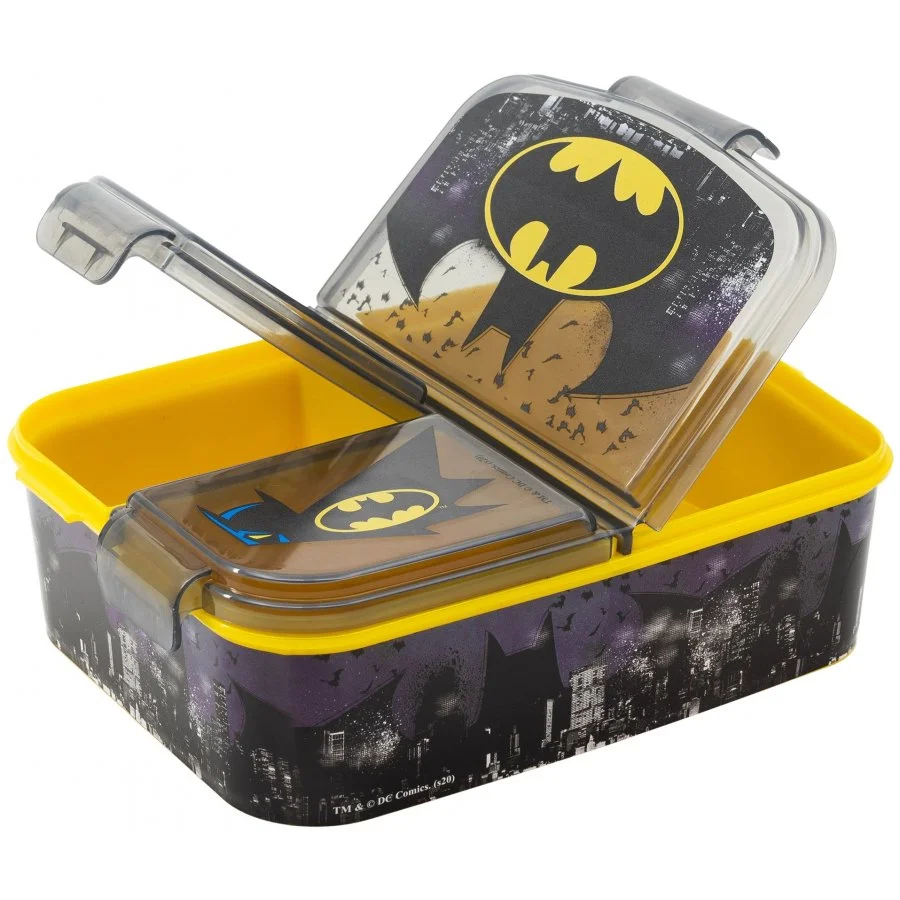 Dětský svačinový multibox Batman - DC Comics se třemi přihrádkami. Odolná krabička na svačinu ideální do školy i na cesty a výlety. Víko je částečně průhledné pro snadnější přehled o obsahu boxu a zdobí jej loga Batmana a netopýři. Tato dóza na jídlo, nebo na jiné drobné předměty je vhodná pro děti od 3 let a není vhodná do myčky na nádobí, ani do mikrovlnné trouby. Je vyrobená ze zdravotně nezávadného materiálu bez obsahu BPA. K čištění nepoužívejte abraziva ani detergenty. Rozměry tohoto boxu na svačinu jsou cca 17 x 13,5 x 5,5 cm, jeho hmotnost je 150 gr.