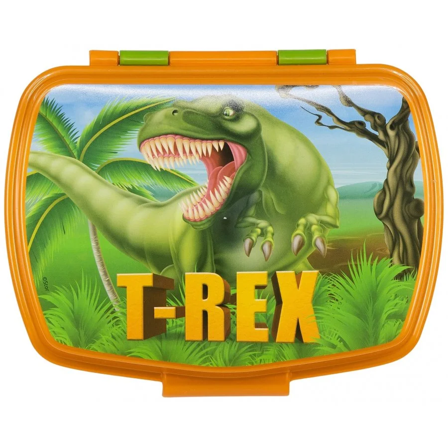 Svačinový box s dinosaurem - Tyrannosaurus Rex. Krabička na svačinu do školy i na cesty a výlety. Víko zdobí obrázek nejdravějšího dinosaura T-Rexe. Tato dóza na jídlo, nebo na jiné drobné předměty je vhodná pro děti od 3 let a není vhodná do myčky na nádobí, ani do mikrovlnné trouby. K čištění nepoužívejte ani abraziva a detergenty. Rozměry tohoto boxu na svačinu jsou cca 17 x 14 x 5,6 cm.