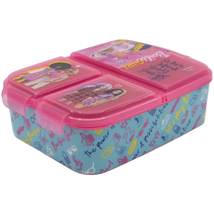 Svačinový multibox Barbie se třemi přihrádkami. Odolná krabička na svačinu ideální do školy i na cesty a výlety. Víko je částečně průhledné pro snadnější přehled o obsahu boxu a zdobí jej obrázky panenek Barbie. Tato dóza na jídlo, nebo na jiné drobné předměty je vhodná pro děti od 3 let a není vhodná do myčky na nádobí, ani do mikrovlnné trouby. Je vyrobená ze zdravotně nezávadného materiálu bez obsahu BPA. K čištění nepoužívejte abraziva ani detergenty. Rozměry tohoto boxu na svačinu jsou cca 17 x 13,5 x 5,5 cm, jeho hmotnost je 150 gr.