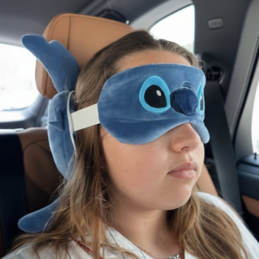 Oční maska s cestovním polštářkem Lilo & Stitch se zapínáním na zip a praktickou karabinkou na zavěšení na batoh. Po rozepnutí se rozloží a uvnitř ukrývá oční masku; po jejím nasazení zůstane rozložený polštářek za hlavou a poskytne pohodlí při cestování.
