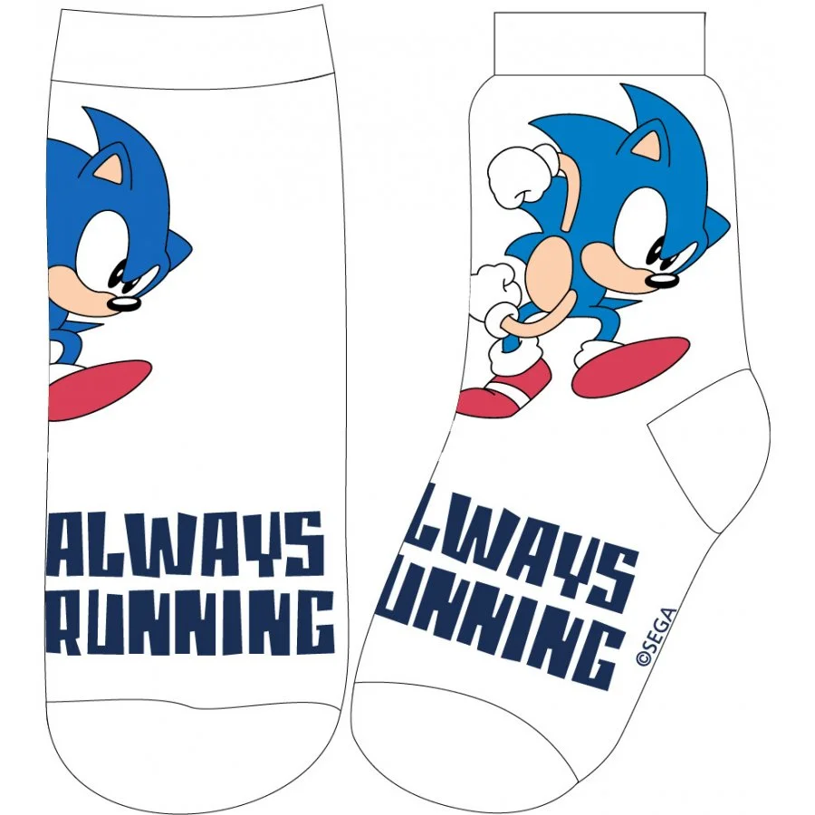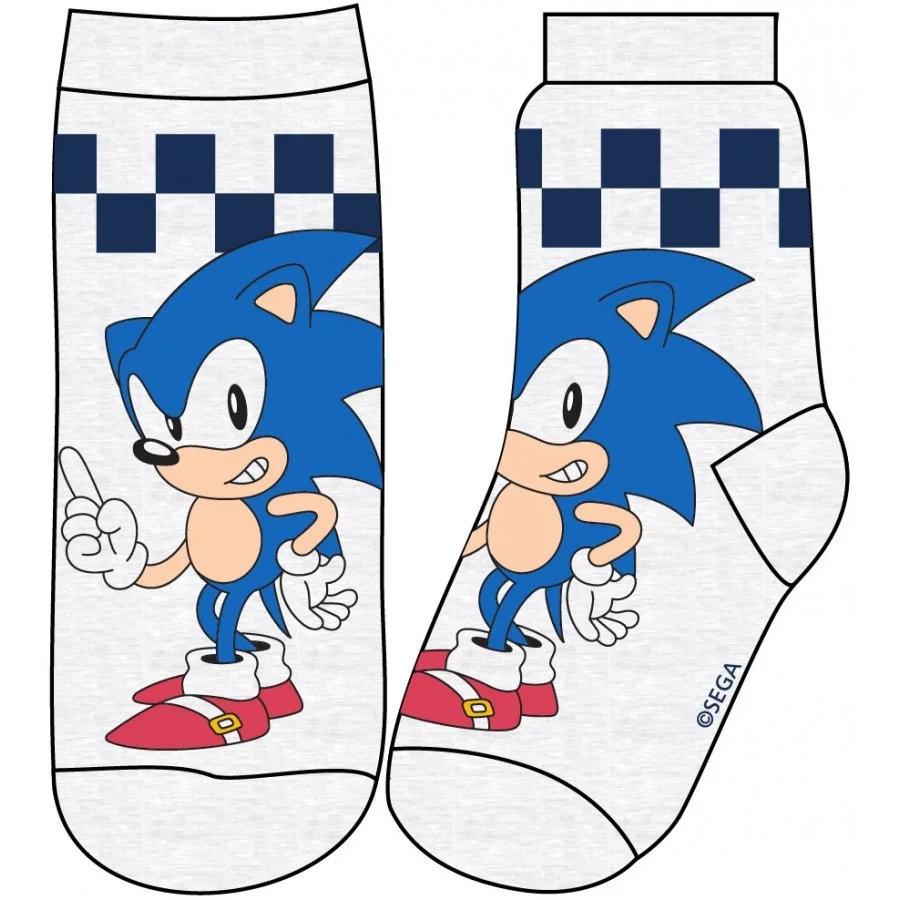 Tři páry ponožek Ježek Sonic. Sada obsahuje jeden pár bílých ponožek s obrázkem Soníka a nápisem Always Running, pár šedě melírovaných ponožek opět s obrázkem soníka a šachovnicovým vzorem pod lemem a pár modrých ponožek s portréty Soníka, hvězdičkami a žlutou iniciálou jeho jména "S". Tyto ponožky získaly mezinárodní certifikát OEKO-TEX STANDARD 100, který zaručuje rozměrovou a barevnou stálost materiálu i to, že výrobek neobsahuje škodlivé látky.