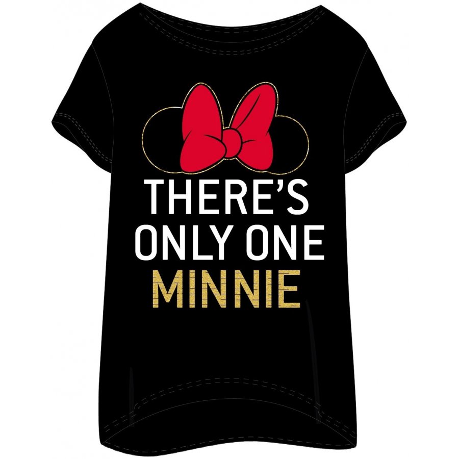 Dámské spací tričko Disney - motiv There's only one Minnie, což v překladu znamená Tady je pouze jedna Minnie! Kontura okolo mašle a nápis MINNIE jsou zlaté a třpytivé. Nabízíme černou variantu, která je vyrobena ze 100% bavlny a šedě melírovanou variantu, která je vyrobena z 98% bavlny a 2% polyesteru z důvodu melírování - viz výběr barvy a velikosti níže.