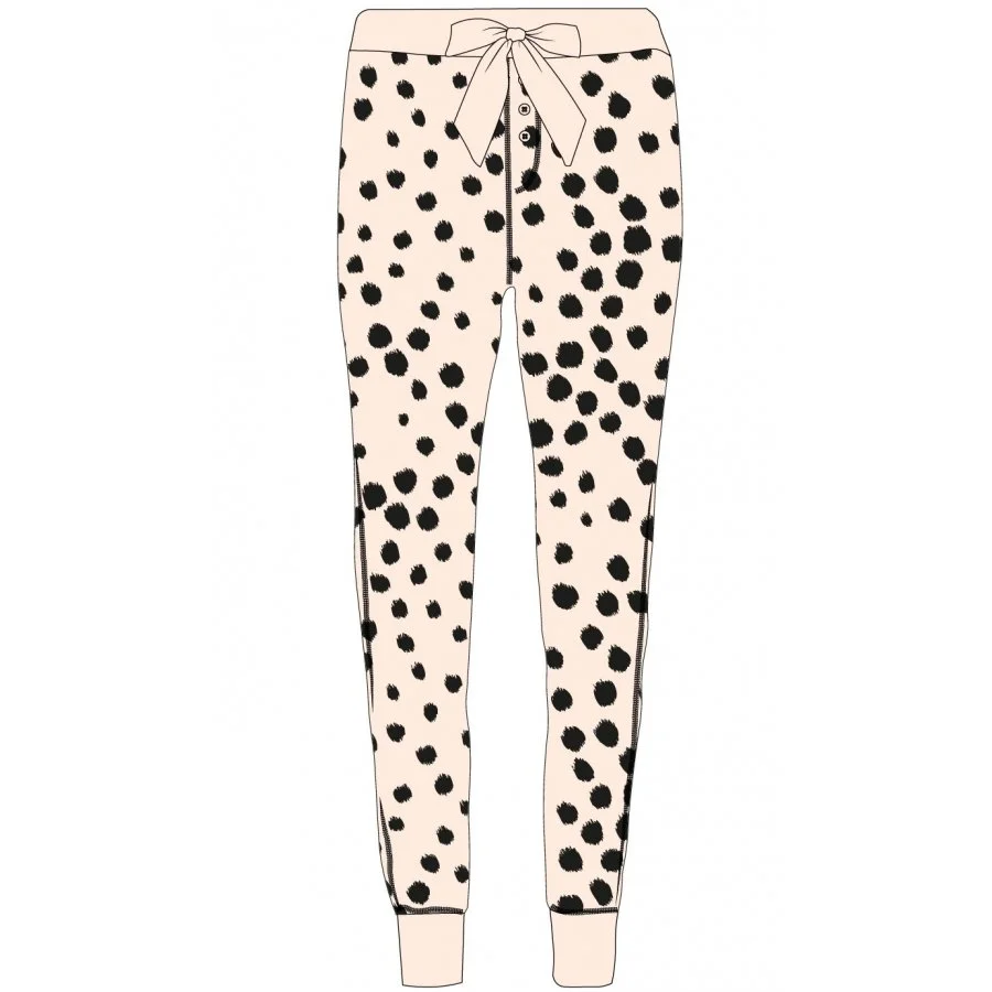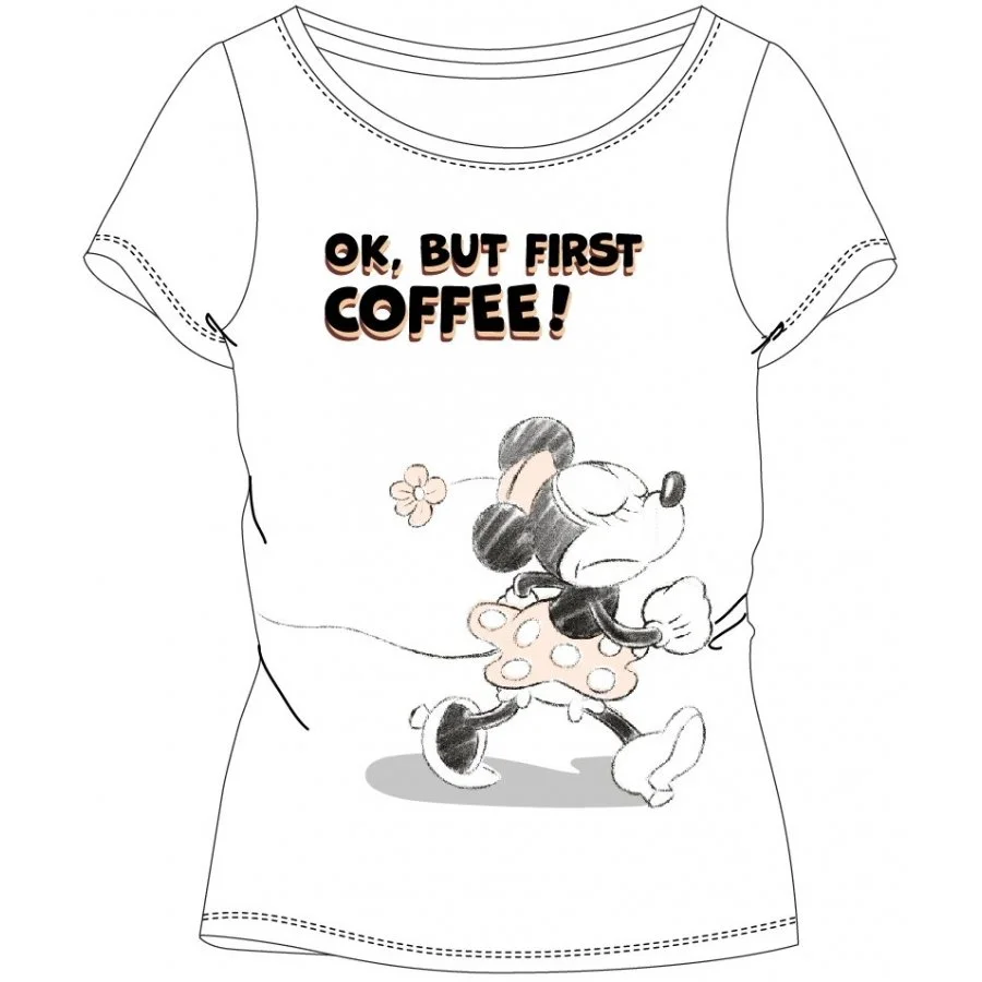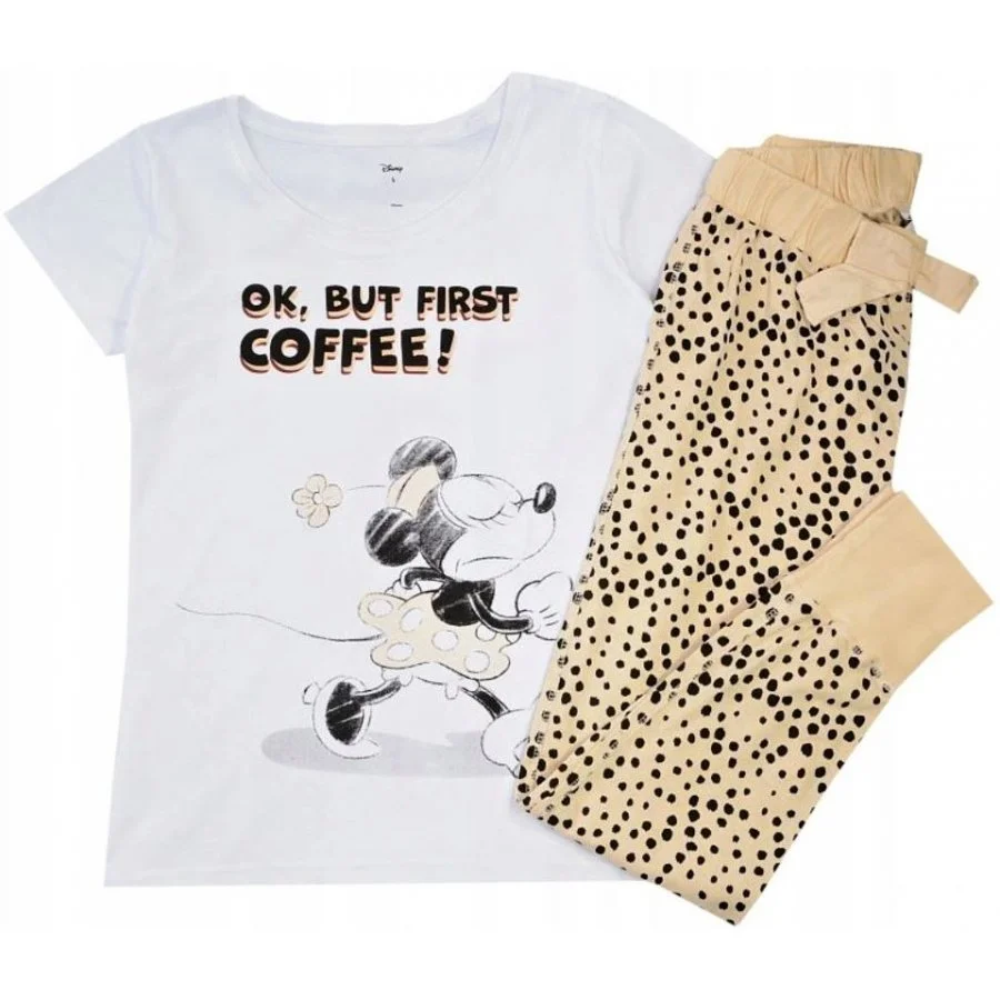 Pohodlné bavlněné pyžamo Minnie Mouse - Disney - motiv Ok, but first coffee. Pyžamo s krátkým rukávem a dlouhými nohavicemi. Toto pyžamo je vyrobeno ze 100% bavlny. Přední stranu horního dílu zdobí obrázek zjevně rozhodnuté myšky Minnie a nápis, který v překladu znamená Ok, ale prvně kávu. S čím myška souhlasí se můžeme jen domnívat. Nohavice jsou puntíkované se vzorem kůže divoké šelmy a s mašlí v pase.