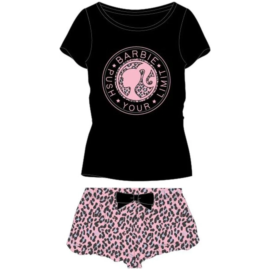 Dámské pyžamo Barbie - s krátkým rukávem a krátkými nohavicemi. Je vyrobeno ze 100% bavlny. Horní díl je tričko s krátkým rukávem a kulatým výstřihem bílé, nebo černé barvy - viz výběr barvy a velikosti. Zdobí jej růžový potisk se siluetou hlavy světově nejznámější a nejprodávanější panenky od firmy Mattel. Spodní díl je u obou variant světle růžový s leopardím vzorem a je ozdobený mašličkou.