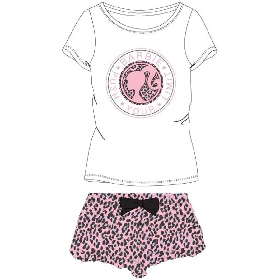 Dámské pyžamo Barbie - s krátkým rukávem a krátkými nohavicemi. Je vyrobeno ze 100% bavlny. Horní díl je tričko s krátkým rukávem a kulatým výstřihem bílé, nebo černé barvy - viz výběr barvy a velikosti. Zdobí jej růžový potisk se siluetou hlavy světově nejznámější a nejprodávanější panenky od firmy Mattel. Spodní díl je u obou variant světle růžový s leopardím vzorem a je ozdobený mašličkou.