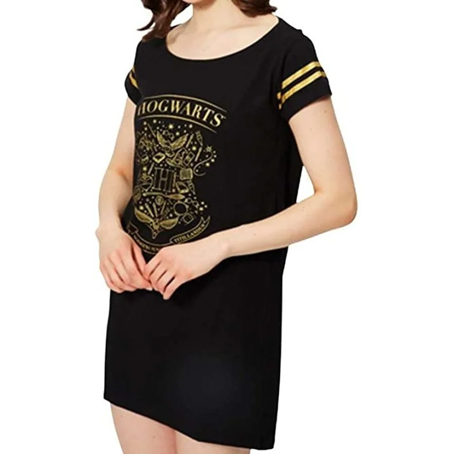 Dámské dlouhé spací tričko / noční košile Harry Potter. Na přední straně je velký nápis HOGWARTS a symboly spojené se školou čar a kouzel v Bradavicích. Toto triko nabízíme se zlatým potiskem na černém tričku ze 100% bavlny, nebo s potiskem stříbrné barvy na šedě ... Celý text