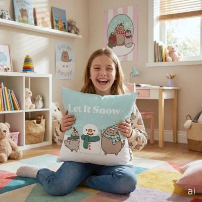Dekorační polštář Pusheen se zimním motivem Let It Snow. Každou stranu polštáře zdobí jiný motiv ...