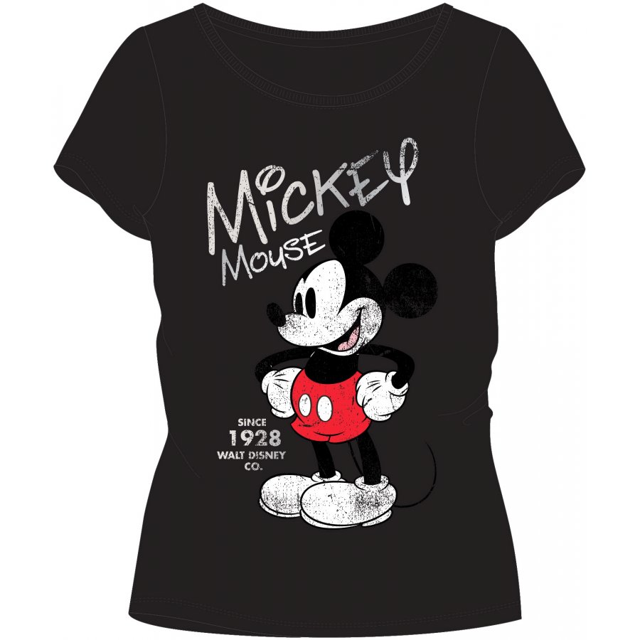 Dámské tričko s kulatým výstřihem a krátkým rukávem Disney - motiv Mickey Mouse 1928. Přední stranu zdobí obrázek legendárního Mickey Mouse se stříbrně třpytivými nápisy s jeho jménem a letopočtem zrození. Toto tričko nabízíme v černém, nebo červeném provedení - viz výběr velikosti a barvy. Obrázek na červeném tričku je odlišný než obrázek na černém tričku.