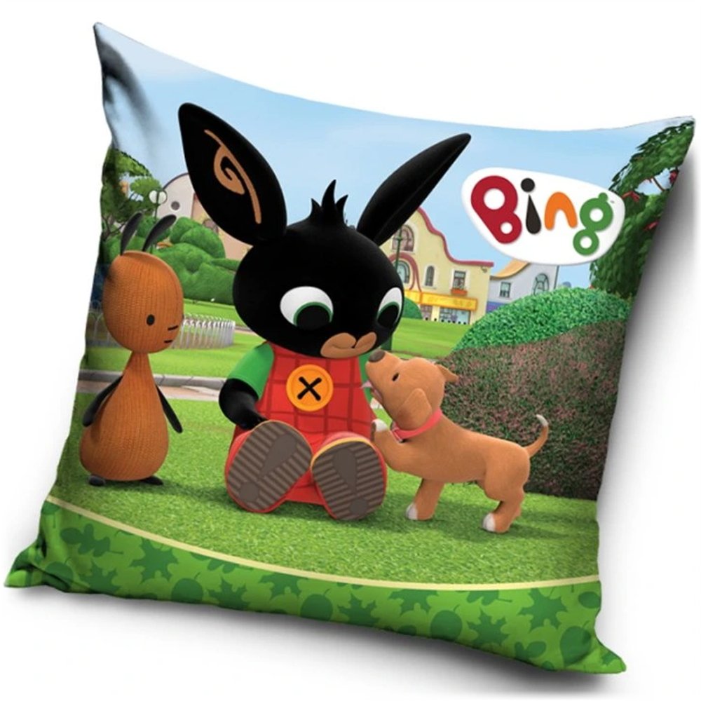 Dětský polštářek s motivem Zajíčka Binga a štěněte. Povlak je vyroben z hebkého veluru o gramáži 190 g/m², velmi příjemného na dotek, který si uchovává syté barvy i po mnoha praních, se zapínáním na zip. Uvnitř je výplň zašitá ve vlastním obalu, a je tedy vyjímatelná. Rozměr polštáře je 40 x 40 cm.