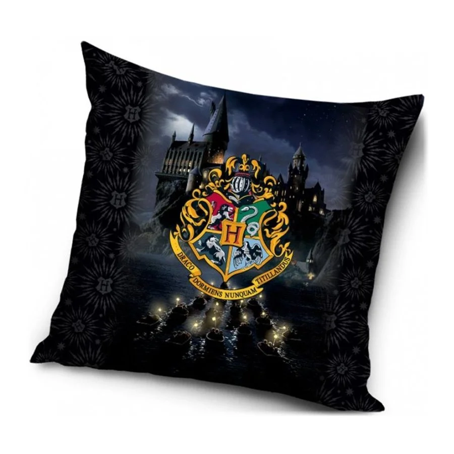 Polštářek Harry Potter - motiv "Na loďkách do Bradavic". Povlak polštáře je vyroben z příjemně jemného nemačkavého materiálu a má zapínání na zip. Obě strany zdobí stejný motiv s lodičkami, které po tmě plují do školy čar a kouzel v Bradavicích s velkým, barevným erbem Hogwarts uprostřed. Výplň je zašitá ve vlastním obalu. Je tedy vyjímatelná pro snazší údržbu povlaku. Rozměry tohoto polštáře jsou 40 x 40 cm ± 2 cm.