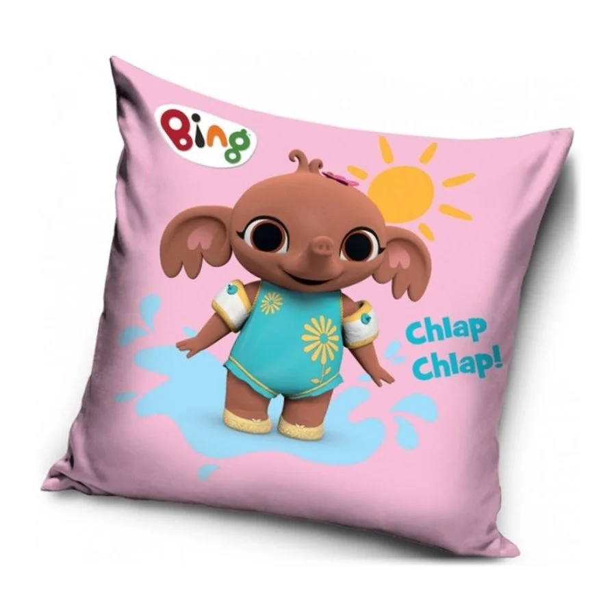 Polštářek s obrázkem malé slonice Suly, kamarádky Zajíčka Binga ze stejnojmenného animovaného seriálu pro děti. Povlak polštáře je vyroben z příjemně jemného nemačkavého materiálu a má zapínání na zip. Obě strany zdobí stejný motiv. Výplň tvoří materiál z dutých vláken, který je zašitý v obalu z netkané textilie. Rozměr polštáře je 40 x 40 cm +/- 2 cm.