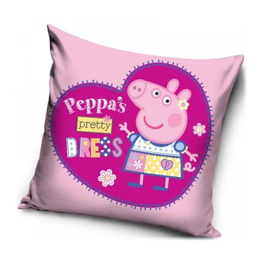 Polštářek Prasátko Peppa - motiv Peppa’s pretty dress. Povlak polštáře je vyroben z příjemně jemného nemačkavého materiálu a má zapínání na zip. Obě strany zdobí stejný motiv z animovaného seriálu Prasátko Peppa s prasátkem Pepinou, která se vydala na přehlídková mola. Výplň z dutých vláken je zašitá v textilním obalu a je tedy vyjímatelná. Rozměry polštáře jsou 40 x 40 cm +/- 2 cm.