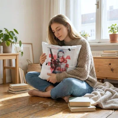 Povlak na polštářek Papírový dům – Money Heist s motivem Bella Ciao. Je vyroben z příjemně ...