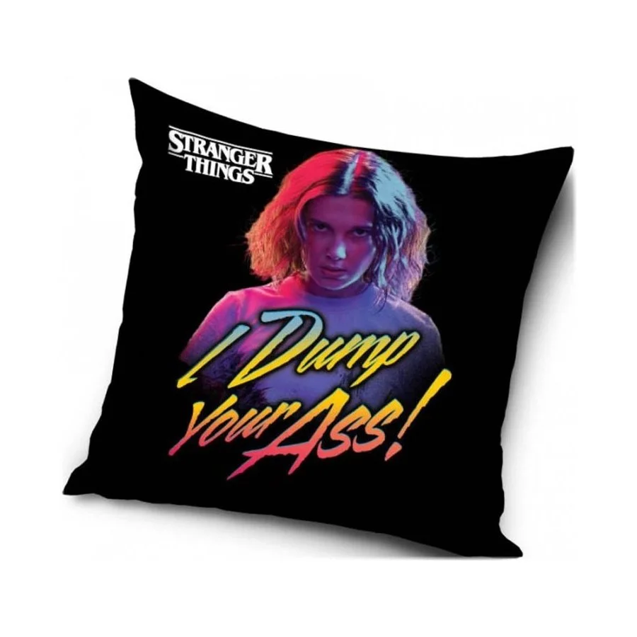 Polštářek Stranger Things - motiv Eleven. Jistě ho ocení všichni fanoušci amerického sci-fi hororového a mysteriózního televizního seriálu Stranger Things z produkce Netflix. Zdobí ho obrázek dívky "Jedenáctky" s psychokinetickými schopnostmi na niž v Hawkinské laboratoři prováděli pokusy. Jméno získala podle tetování 011, anglicky Eleven, a proto jí přátelé říkají také zkráceně El. Nápis, který je na polštářku raději nebudeme překládat, protože snad každý fanoušek seriálu ví, co tento Elin výraz znamená. Povlak polštáře je vyroben z příjemně jemného nemačkavého materiálu a má zapínání na zip. Obě strany zdobí stejný motiv. Uvnitř je polštářek s výplní z dutých vláken. Velikost je 40 x 40 cm +/- 2 cm.