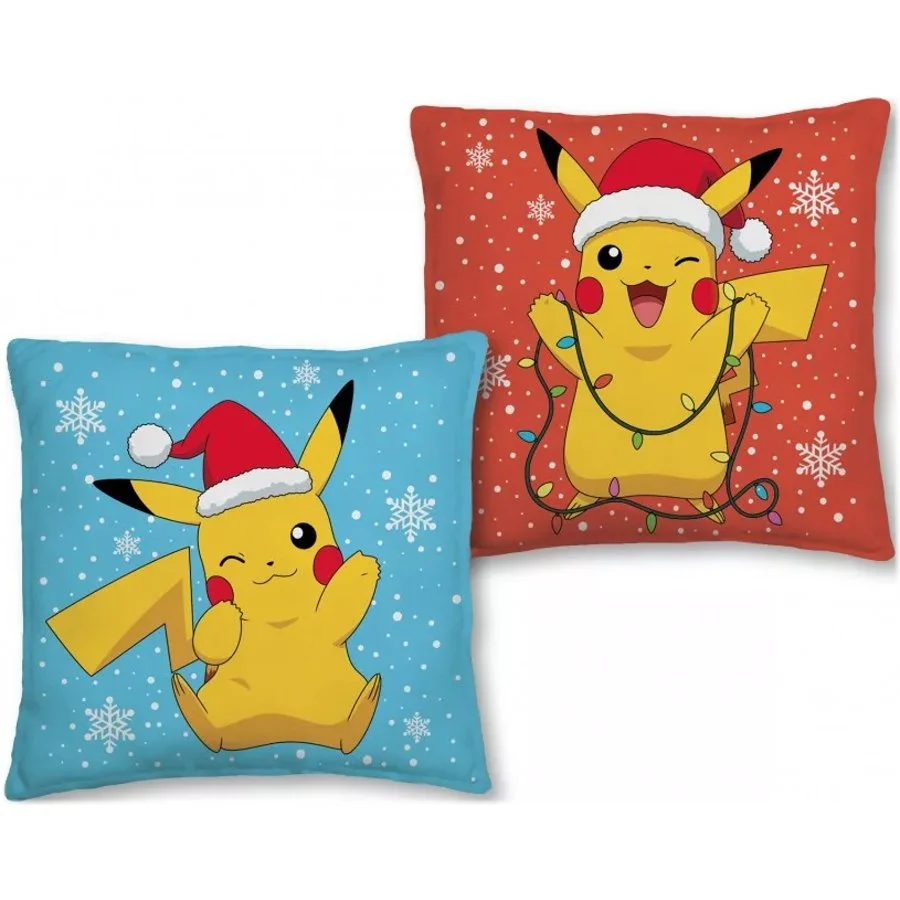 Polštářek s pokémonem Pikachu se zimním motivem. Jedna strana je světle modrá a druhá červená s bílými sněhovými vločkami. Na obou stranách je obrázek pokémona Pikachu s červenou čepičkou. Tento polštář je vyrobený z příjemného a jemného materiálu s výplní, která je pevně zašitá uvnitř. Jeho rozměry jsou 40 x 40 cm.