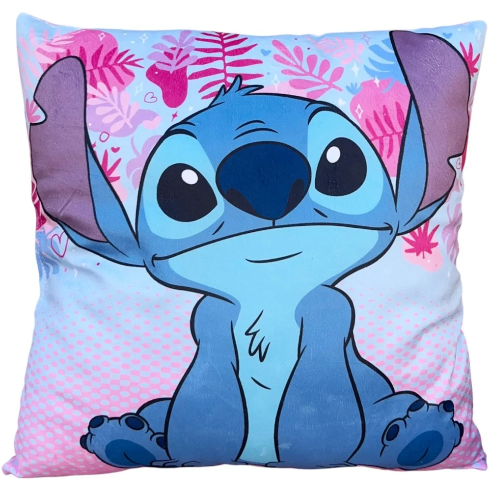 Růžový dětský polštářek Lilo & Stitch - motiv Stitch a Scrump. Tento polštář je vyrobený z příjemného a jemného materiálu s výplní, která je pevně zašitá uvnitř a není tedy vyjímatelná. Motiv na obou stranách polštáře se liší - viz obrázek produktu. Rozměry jsou 38 x 38 cm.