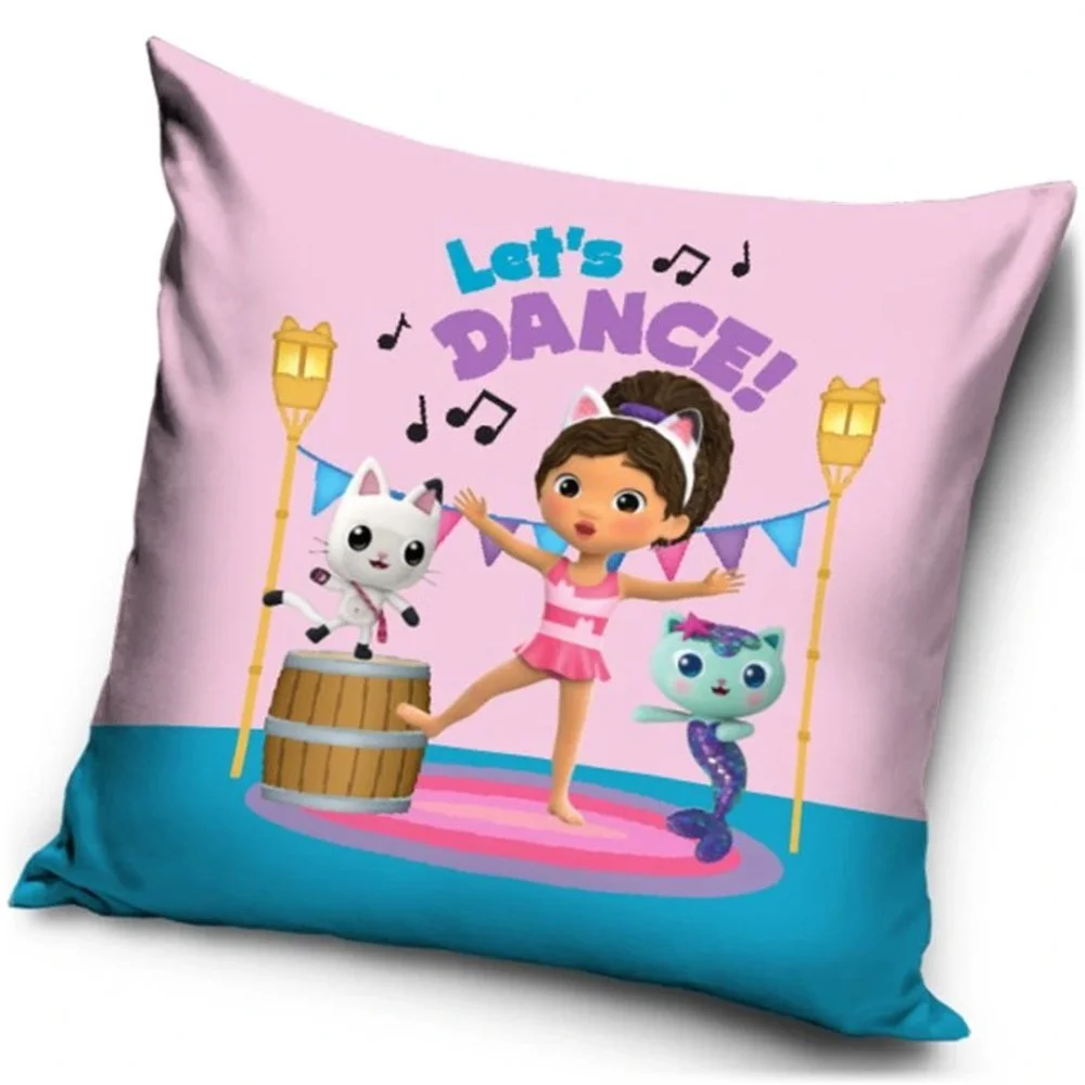 Polštářek Gabby's Dollhouse s motivem Let's Dance! Povlak je vyroben z příjemně jemného a nemačkavého velurového materiálu se zapínáním na zip. Součástí je výplň zašitá ve vlastním povlaku bílé barvy. Rozměry 40 × 40 cm.