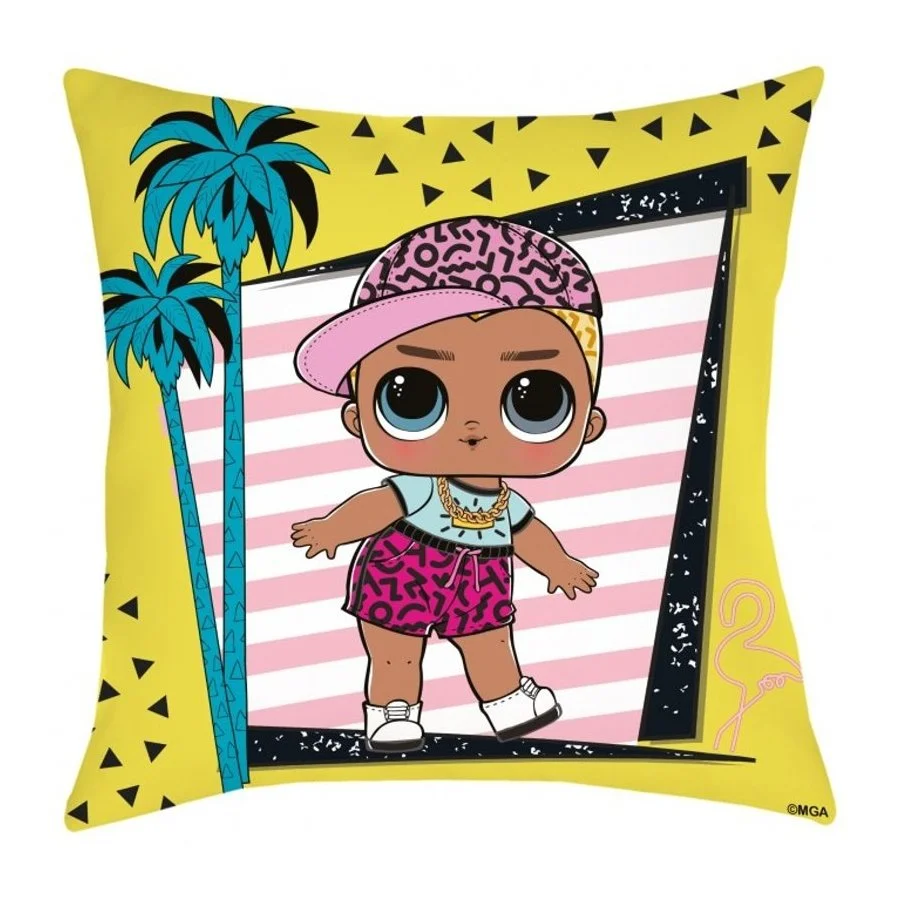 Polštářek L.O.L. Surprise s palmami je vyrobený z příjemného a jemného mikroplyše s výplní, která je pevně zašitá uvnitř. Obě strany polštáře jsou stejné. Lze jej prát při teplotě do 40°C. Rozměry jsou 40 x 40 cm.