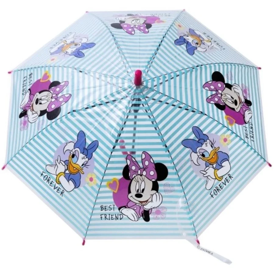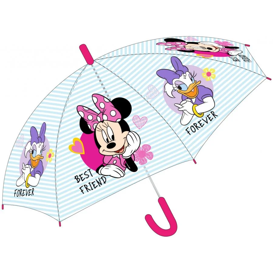Dětský deštník Minnie Mouse a Kačenka Daisy - Disney. Konstrukce deštníku je kovová se samo rozevíracím mechanismem. Potah deštníku je vyroben z transparentního polyolefinového elastomeru (POE), což zaručuje vysokou odolnost. Spodní rukojeť je plastová s příjemně hladkým povrchem. Průměr roztaženého deštníku je cca 70 cm, délka zavřeného deštníku je cca 61 cm. Díky částečně průhledné střeše deštníku se s ním lze dobře orientovat v prostoru i v dešti.