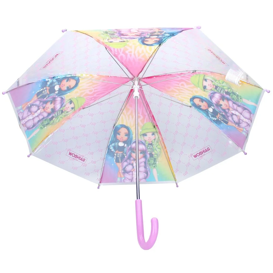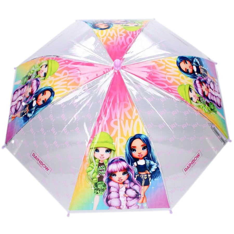 Dívčí deštník Rainbow High. Konstrukce deštníku je kovová, spodní rukojeť je plastová s příjemně hladkým povrchem. Průměr rozevřeného deštníku je cca 68 cm, délka zavřeného deštníku je cca 61 cm. Díky průhledné folii každého druhého panelu se lze s tímto deštníkem dobře orientovat v prostoru i v dešti.