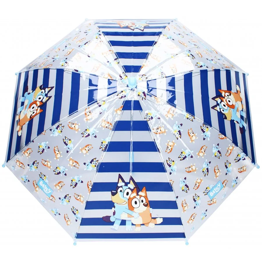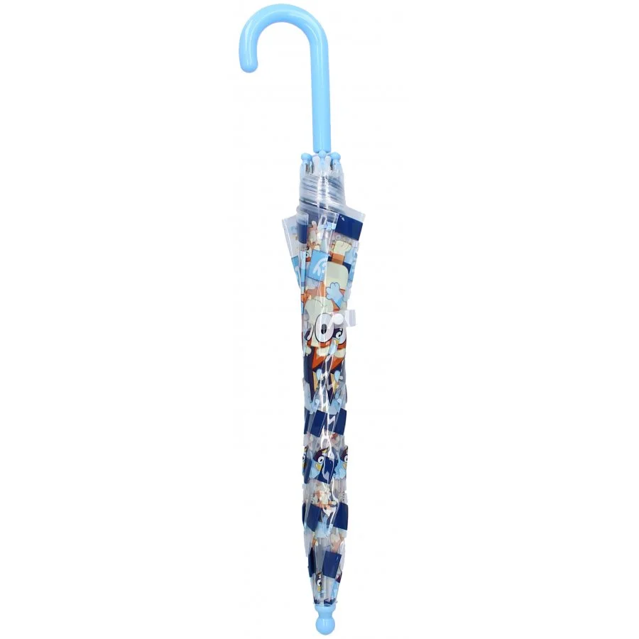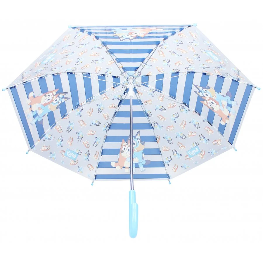 Transparentní deštník s motivem Bluey. Konstrukce deštníku je kovová, potah je vyroben z polyolefinového elastomeru, plastová rukojeť s hladkým povrchem je přizpůsobená pro malé ruce. Průměr rozevřeného deštníku je cca 69 cm, hmotnost pouze 210 g.