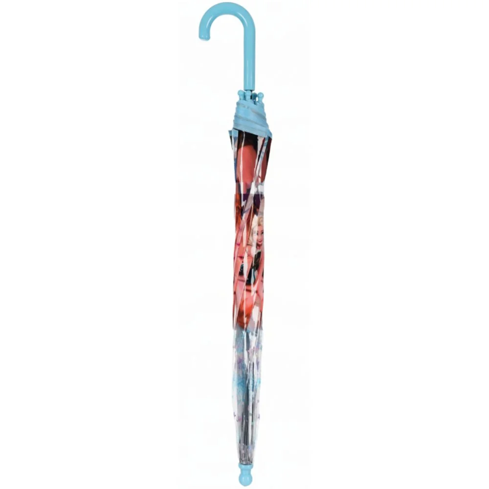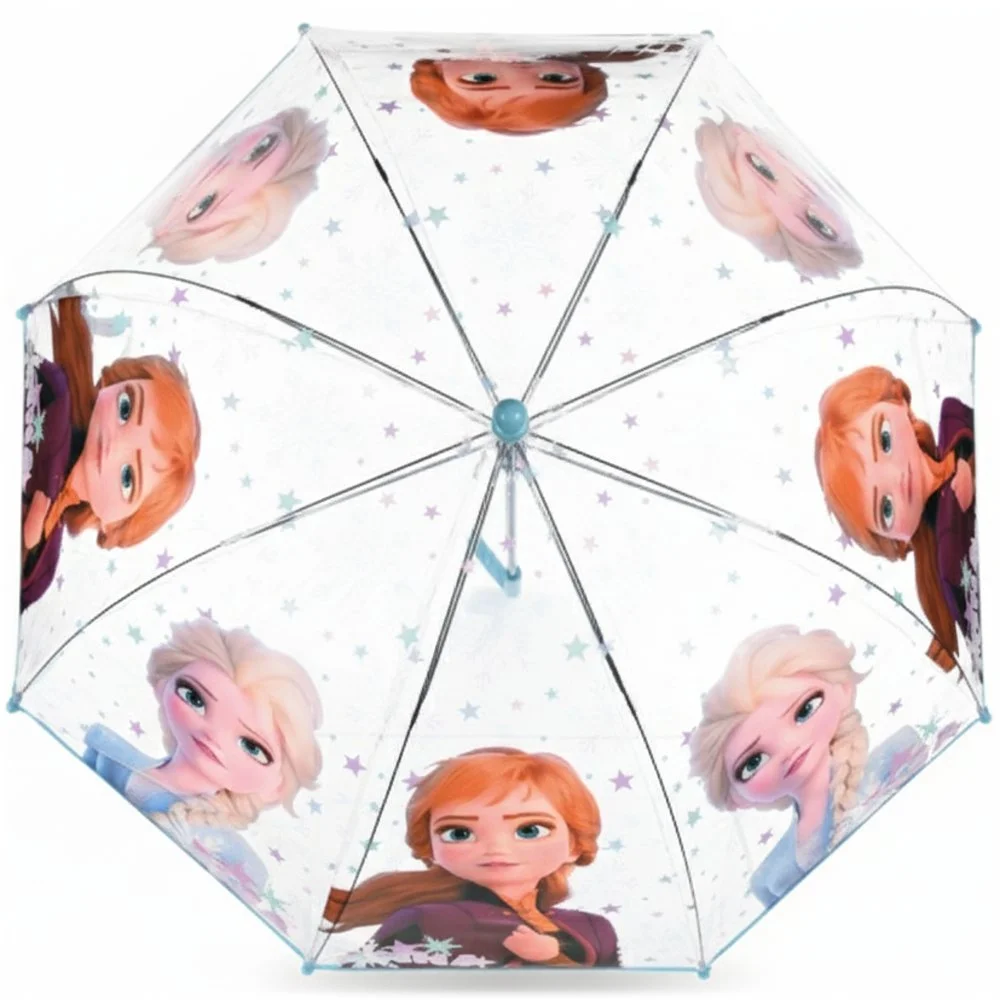 Dětský průhledný deštník s motivem Frozen. Kovová konstrukce, potah z odolného materiálu POE, plastová rukojeť s hladkým povrchem přizpůsobená pro malé ruce. Průměr rozevřeného deštníku je cca 70 cm.