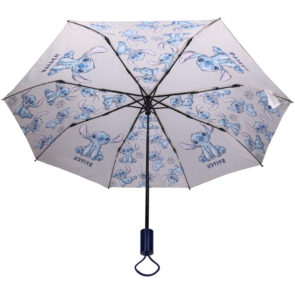 Dětský skládací deštník Stitch. Kovová konstrukce, potah s oblíbeným motivem Lilo & Stitch, plastová rukojeť s hladkým povrchem přizpůsobená pro malé ruce. Průměr rozevřeného deštníku je cca 85 cm, velikost složeného deštníku je cca 5 x 25 cm.