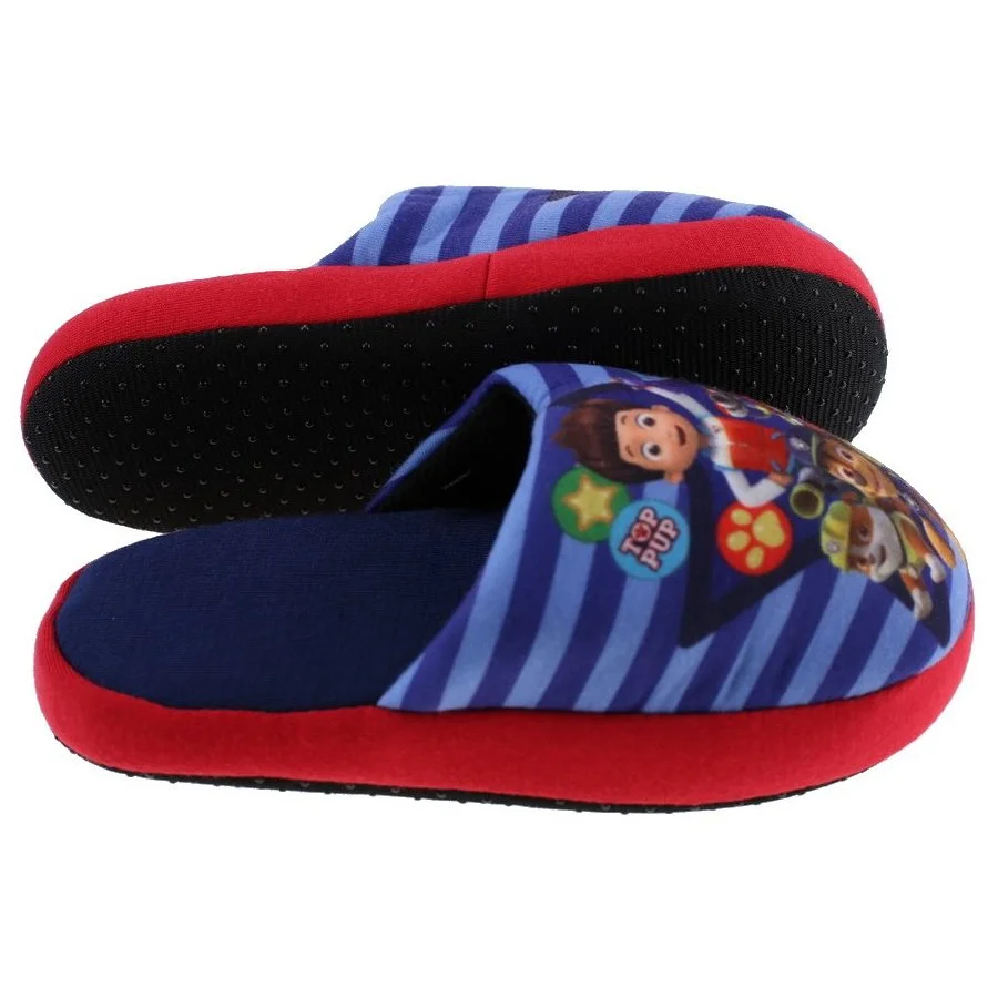Dětské papučky na doma Tlapková patrola - Paw Patrol. Pohodlné pantofle s měkkou, neklouzající podrážkou a plyšovým povrchem s obrázkem party "tlapek" s jejich kamarádem Ryderem. Dodáváme je kombinaci dvou odstínů modré barvy, nebo v červeno modré kombinaci - viz. výběr varianty níže.