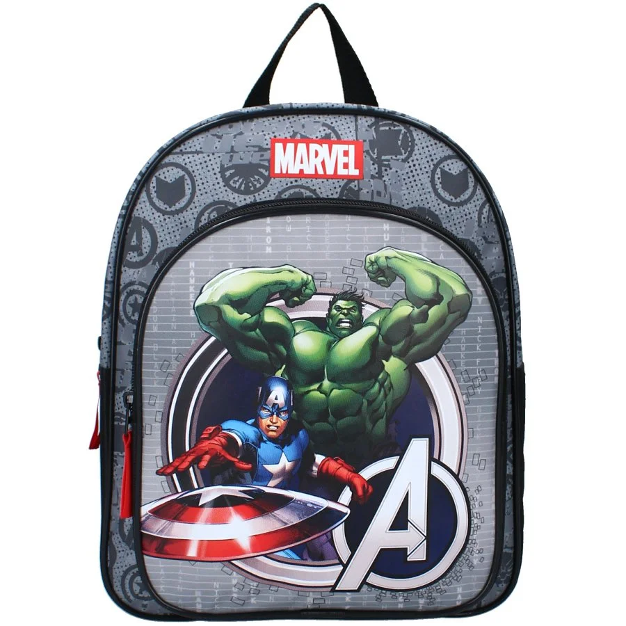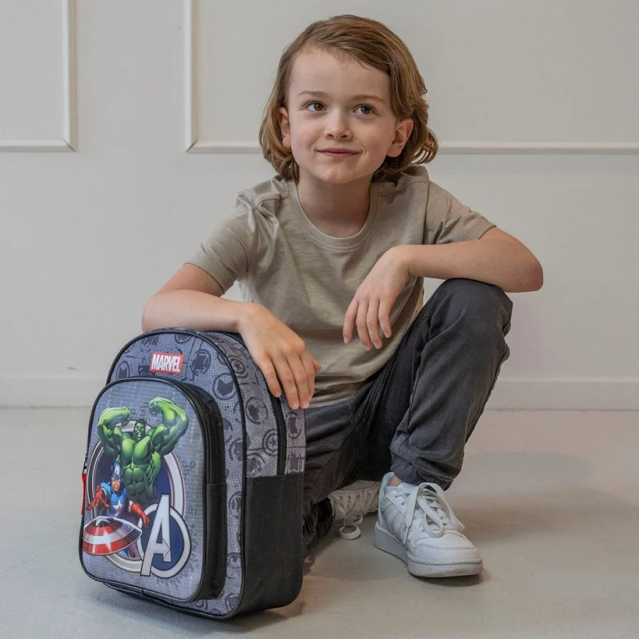 Chlapecký batoh Avengers - MARVEL - s obrázkem oblíbených členů týmu Avengers Kapitána Ameriky a Hulka. Batoh má jednu hlavní komoru a velkou přední kapsu, obě se zapínáním na zip. Popruhy mají měkkou výstelku a jejich délka je nastavitelná. Nechybí ani ouško na nošení v ruce, nebo na zavěšení. Rozměry tohoto batohu Avengers jsou cca 30 x 25 x 11 cm. Poslední obrázek v galerii znázorňuje velikost batůžku k postavě výšky 110 cm.