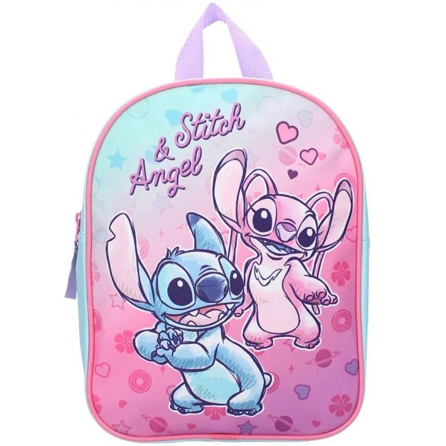 Malý dětský batoh Lilo & Stitch s obrázkem mimozemšťana Stitche a jeho přítelkyně Angel. Hlavní prostor má zapínání na zip a rozměr cca 29 x 22 x 9 cm. Nechybí ani nastavitelné popruhy s výstelkou a praktické ouško na zavěšení.
