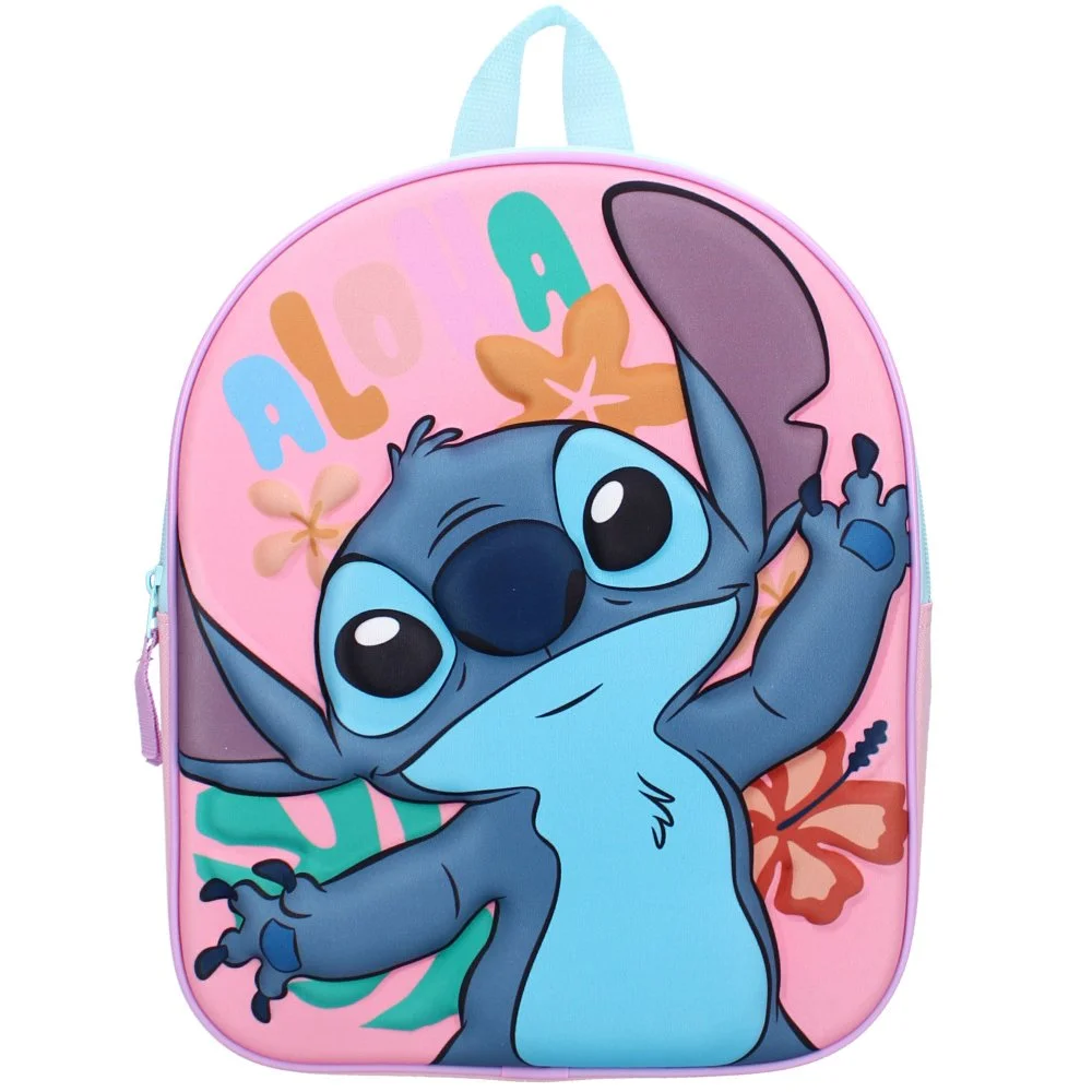 Dětský batůžek Lilo & Stitch s motivem „Aloha“ a plastickým 3D obrázkem Stitche, který vystupuje téměř 2 cm nad povrch. Má jeden hlavní oddíl na zip a nastavitelné, polstrované popruhy. Rozměry cca 32 x 26 x 11 cm.