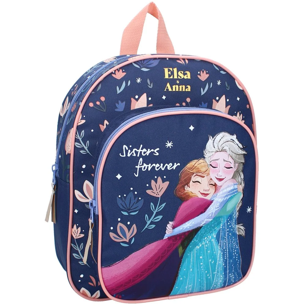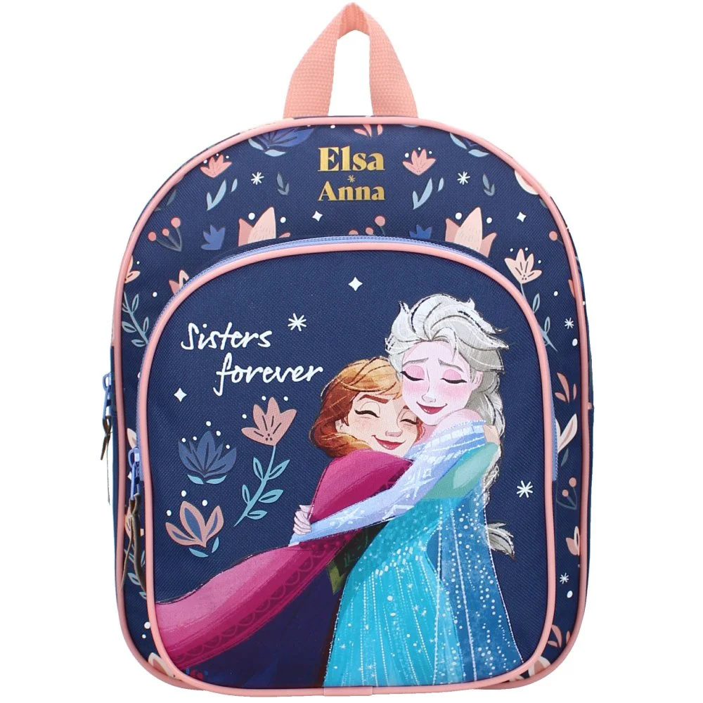 Dětský batůžek Ledové království s obrázkem s obrázkem nerozlučných sester, princezen Anny a Elsy. Má jednu hlavní komoru, prostornou přední kapsu na zip, nastavitelné polstrované popruhy a ouško na nošení v ruce nebo zavěšení. Rozměry cca 30 x 25 x 11 cm.