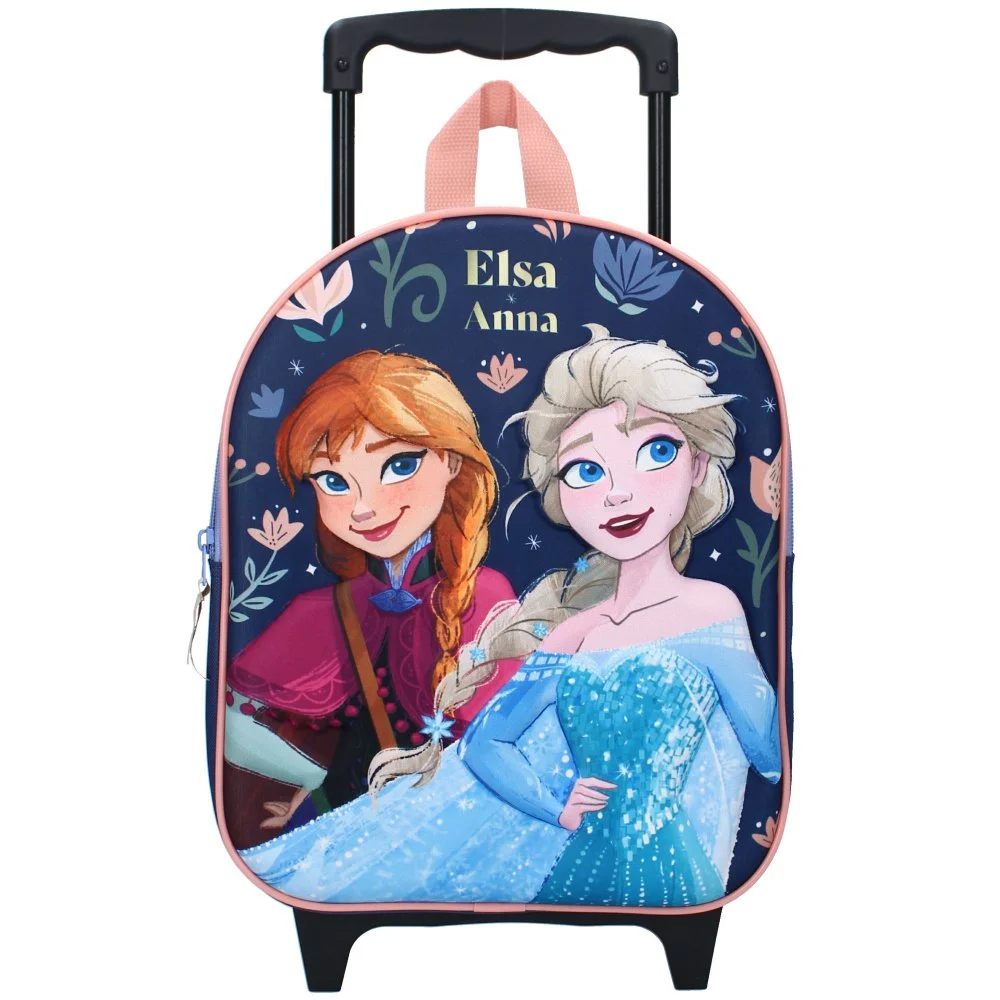Dívčí cestovní kufřík Ledové království s plastickým 3D obrázkem princezen Anny a Elsy na tmavě modrém podkladu. Ideální na víkendové výlety i delší cesty. Hlavní komora 32 x 26 x 11 cm, výsuvné držadlo, kolečka a možnost nošení na zádech díky polstrovaným popruhům.