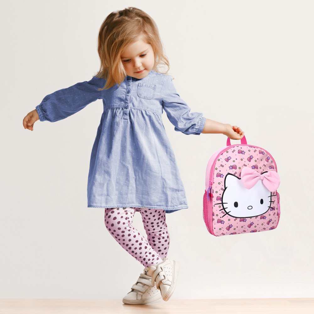 Dětský batůžek Hello Kitty s plastickou mašlí. Prostorná přihrádka na zip, dvě boční pružné síťky na nápoj nebo jiné drobnosti, nastavitelné polstrované popruhy, ouško na nošení v ruce nebo zavěšení a hravý design s hvězdičkami a mašlemi. Rozměry cca 31 x 25 x 10 cm, objem 7,75l.