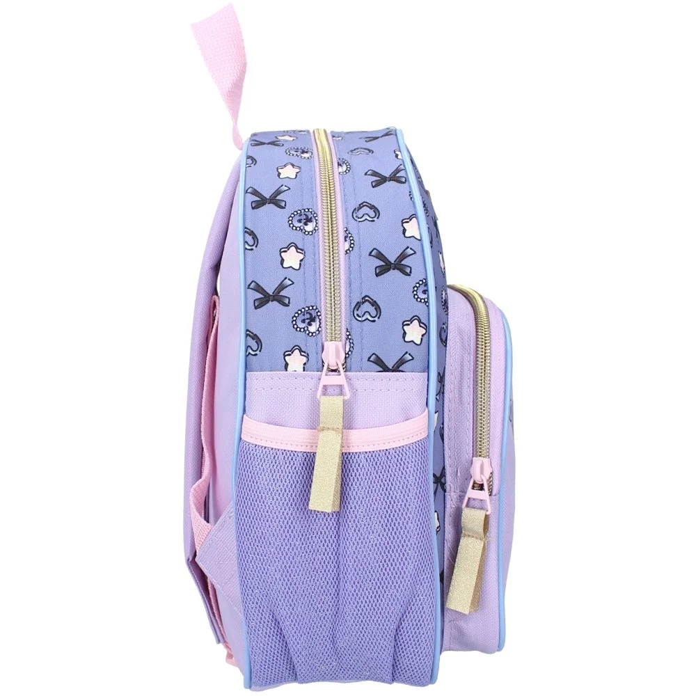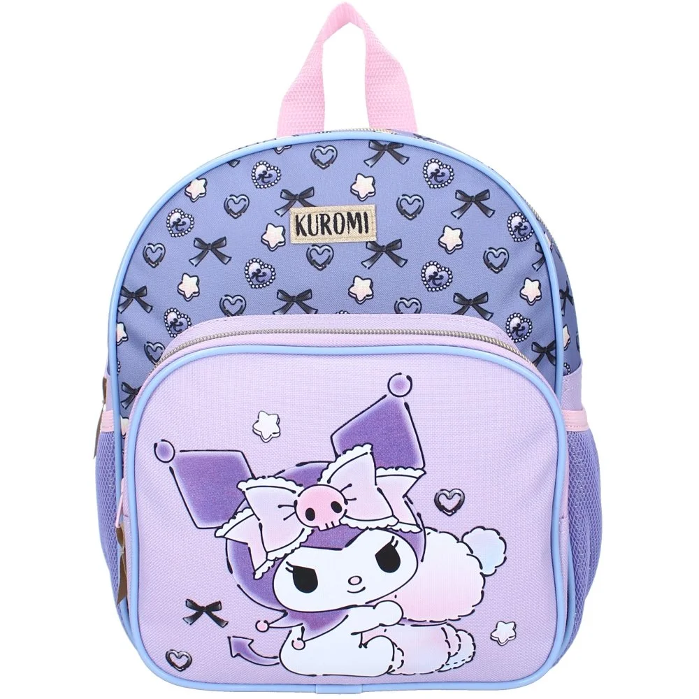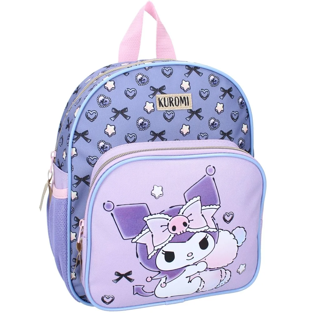 Dětský batůžek Kuromi z kolekce "Forever Yours" v kombinaci fialové a světle modré barvy s roztomilým motivem Kuromi a dekorativními prvky. Nabízí jeden hlavní oddíl, menší kapsu na zip, nastavitelné popruhy a boční kapsy na drobnosti. Rozměry 29 x 23 x 10 cm, objem cca 6,7 l.