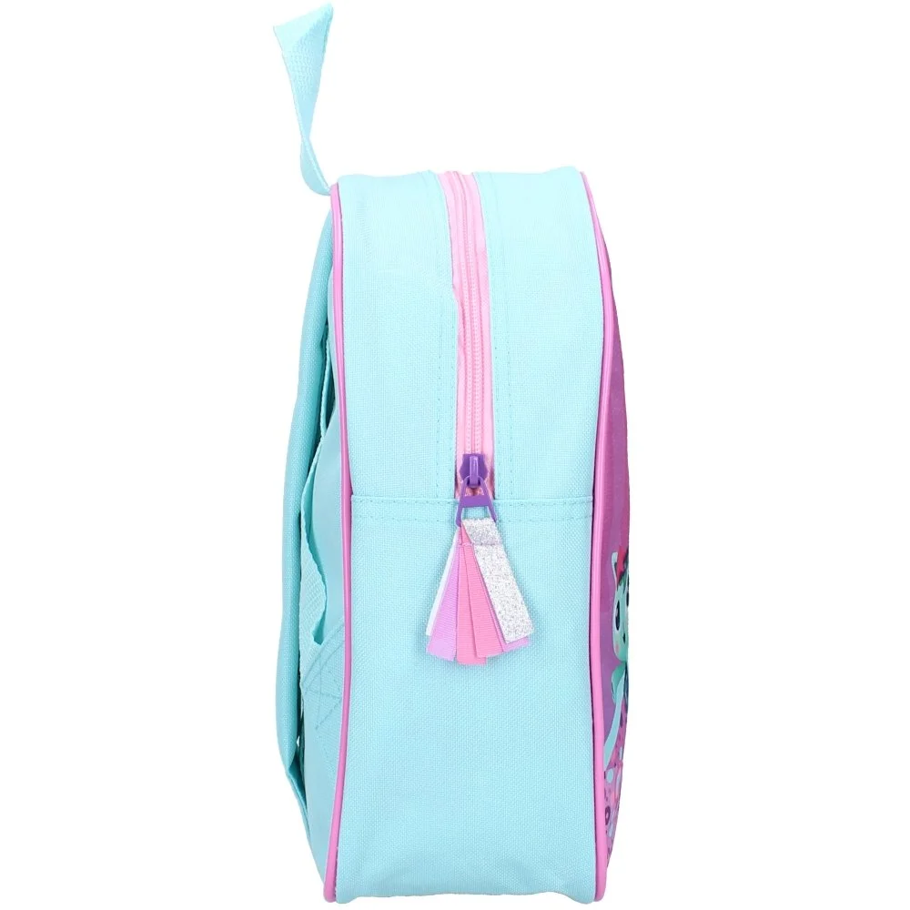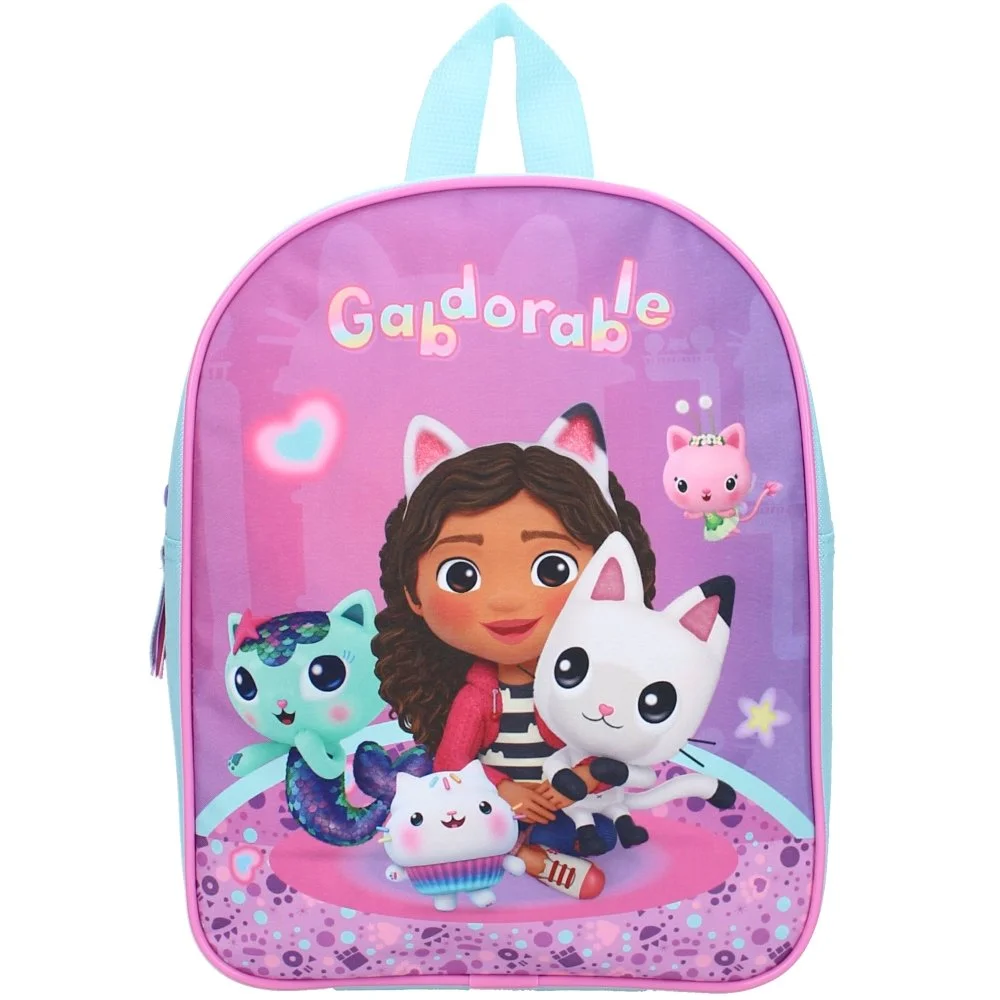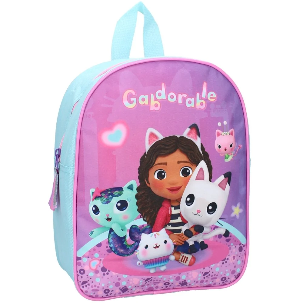 Malý dětský batoh Gábinin kouzelný domek s roztomilým obrázkem holčičky Gábinky a jejích kočičích kamarádů z oblíbeného seriálu Gabby's Dollhouse. Hlavní prostor má zapínání na zip a rozměr cca 29 x 22 x 9 cm. Nechybí ani nastavitelné popruhy s výstelkou a praktické ouško na zavěšení.