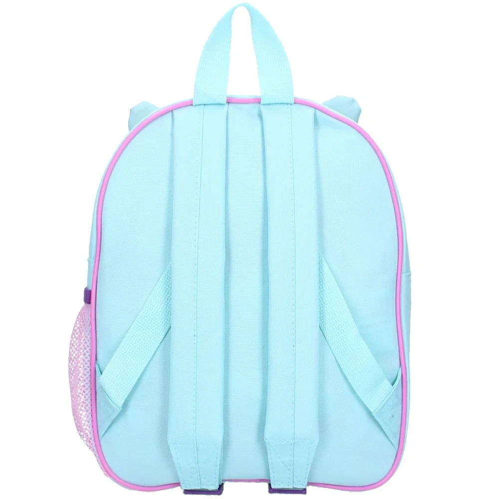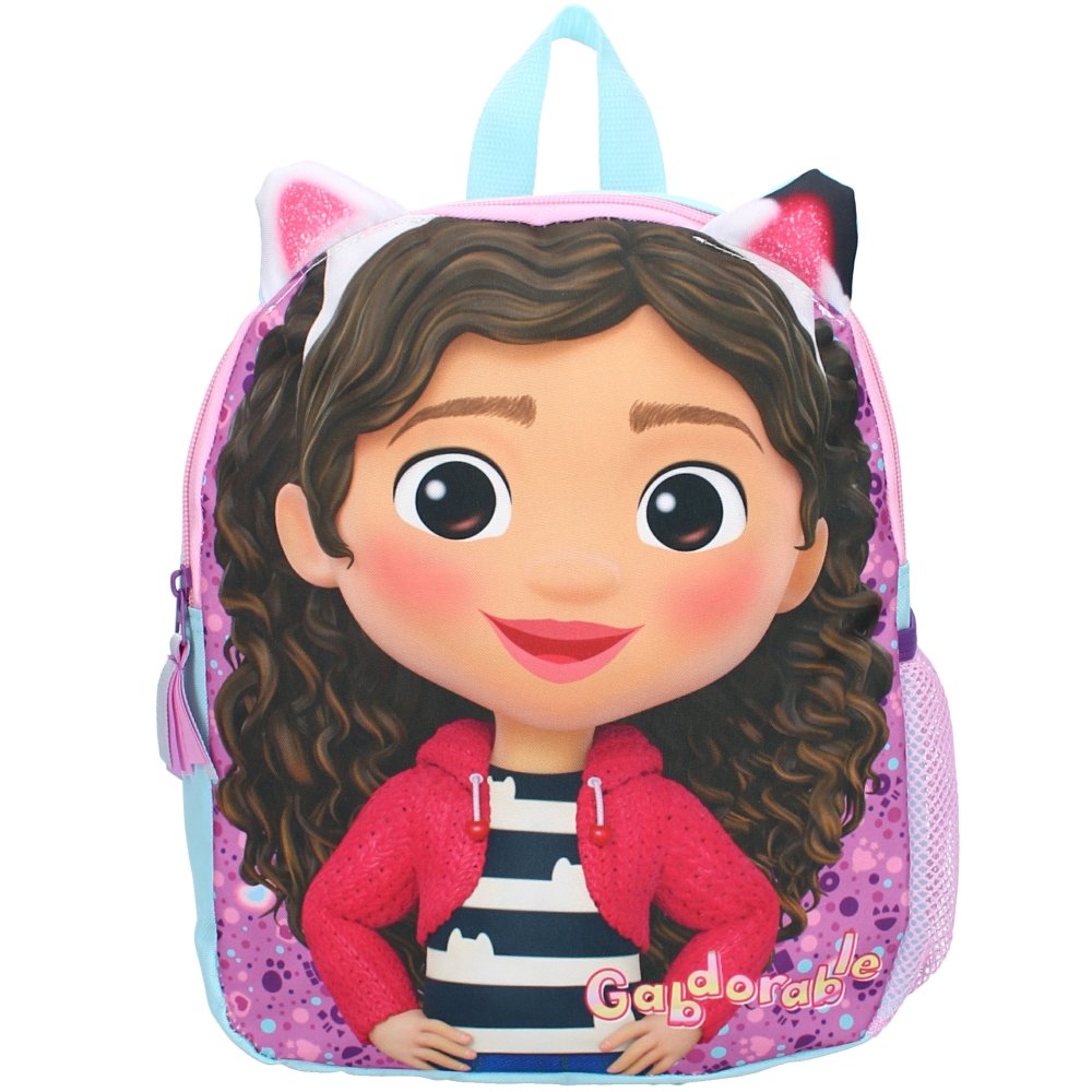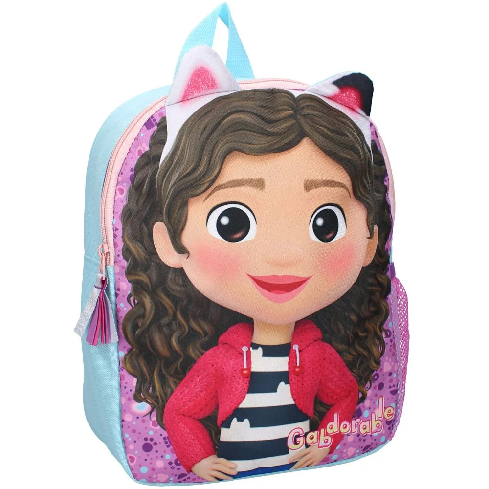 Malý dětský batoh Gábinin kouzelný domek – motiv Gábinka s kočičími oušky. Hlavní prostor má zapínání na zip a rozměr cca 32 x 26 x 11 cm. Nechybí ani boční síťka na nápoj, nastavitelné popruhy s výstelkou a praktické ouško na zavěšení.