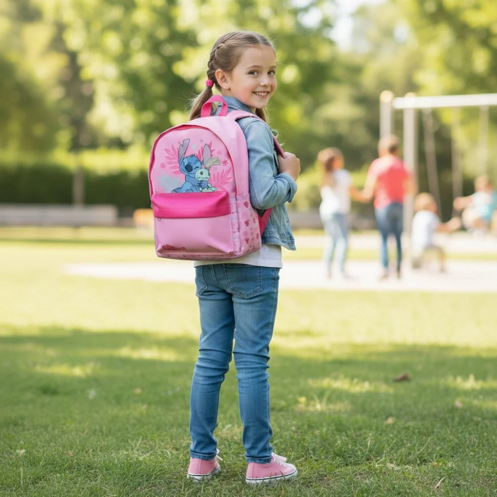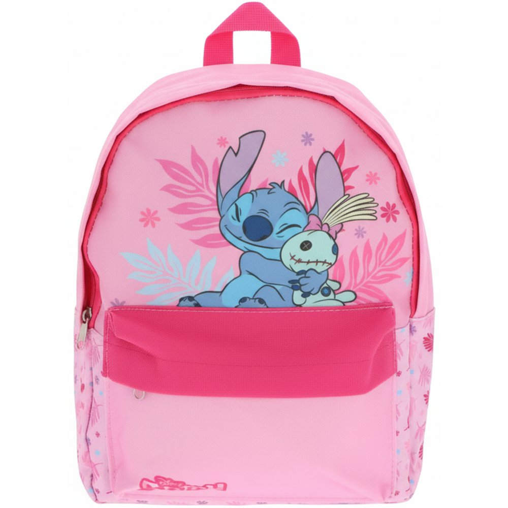 Dětský batoh pro holky Stitch a Scrump s jedním hlavním prostorem a přední kapsou na zip. Má nastavitelné a polstrované popruhy pro pohodlné nošení a ouško na zavěšení či přenášení v ruce. Velikost cca 30 × 24 × 12 cm je ideální do školky, na hřiště i na menší výlet.