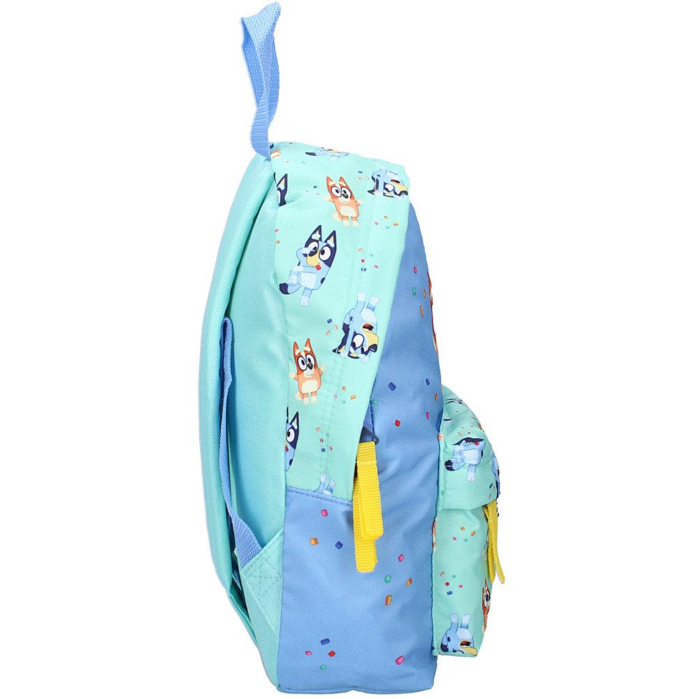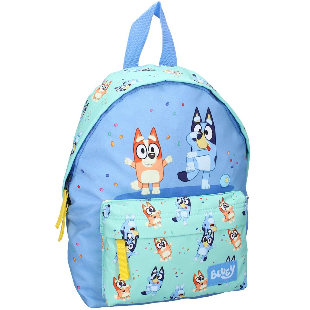 Dětský batůžek Bluey s obrázkem malé fenečky Bluey a její sestry Bingo. Má jeden hlavní prostor a navíc přední přihrádku na zip. Dále je vybaven nastavitelnými polstrovanými popruhy i polstrovanými pěnovými zády a nechybí ani ouško na nošení v ruce nebo zavěšení. Rozměry cca 31 x 22 x 9 cm.