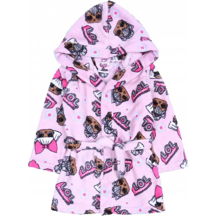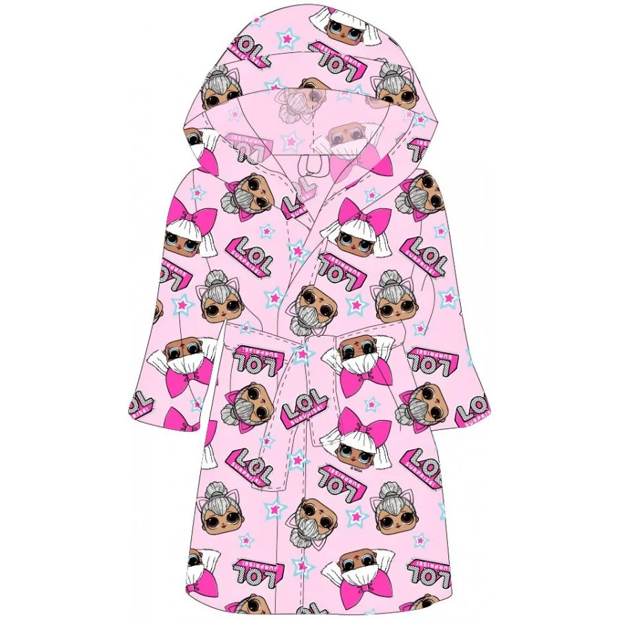 Dětský župánek L.O.L. Surprise. Tento dívčí župan je vyrobený z příjemně jemného, chlupatého a hřejivého materiálu Coral fleece s gramáží 240 gr./m2 světle růžové barvy s logy L.O.L. Surprise a portréty panenek "LOLek". Župan má kapuci a samozřejmě pásek v pase.