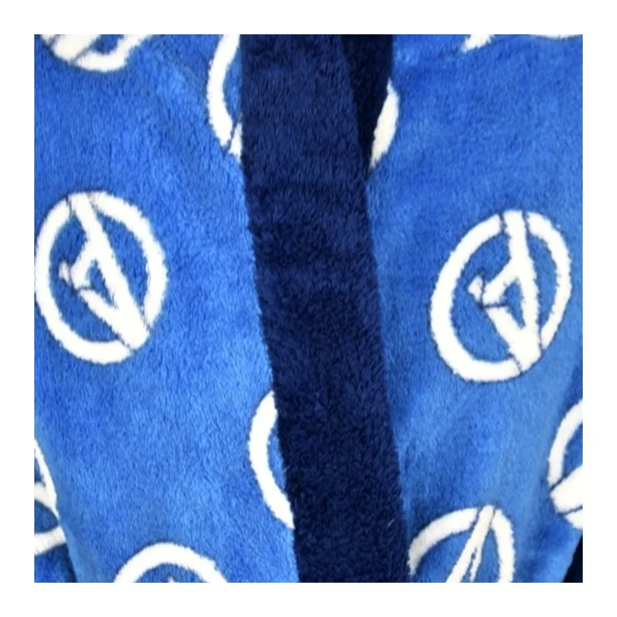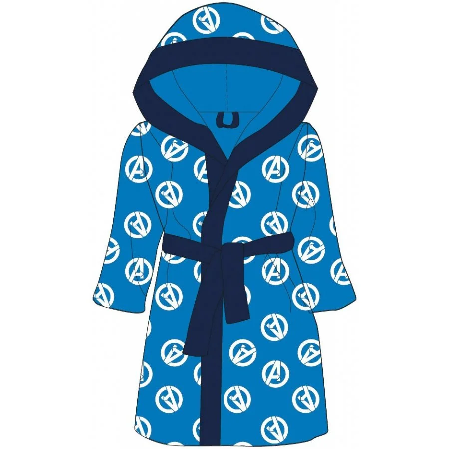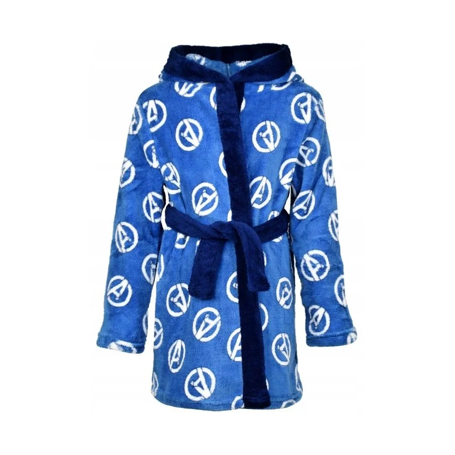 Dětský župánek Avengers. Tento chlapecký župan je vyrobený z příjemně jemného, chlupatého a hřejivého materiálu Coral fleece s gramáží 240 gr./m2 modré barvy s bílými znaky týmu komiksových superhrdinů Avengers. Župan má kapuci a samozřejmě pásek v pase.