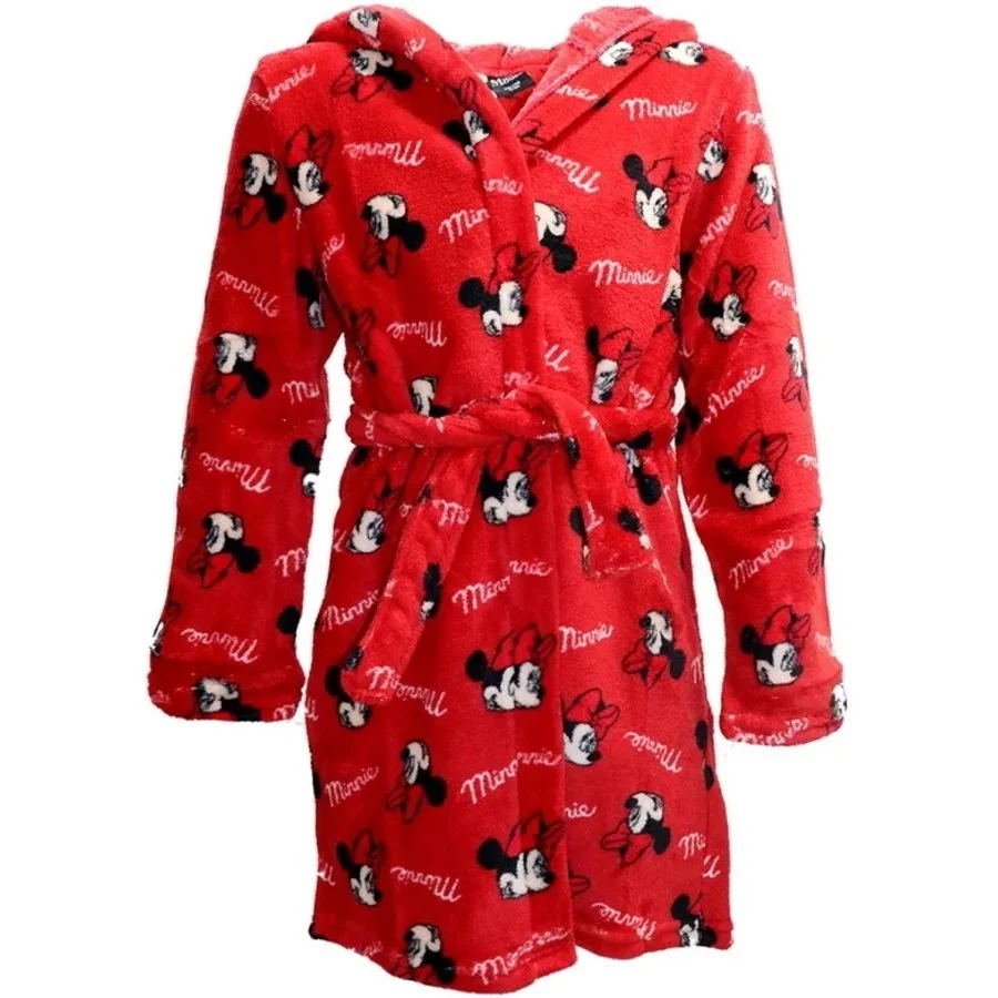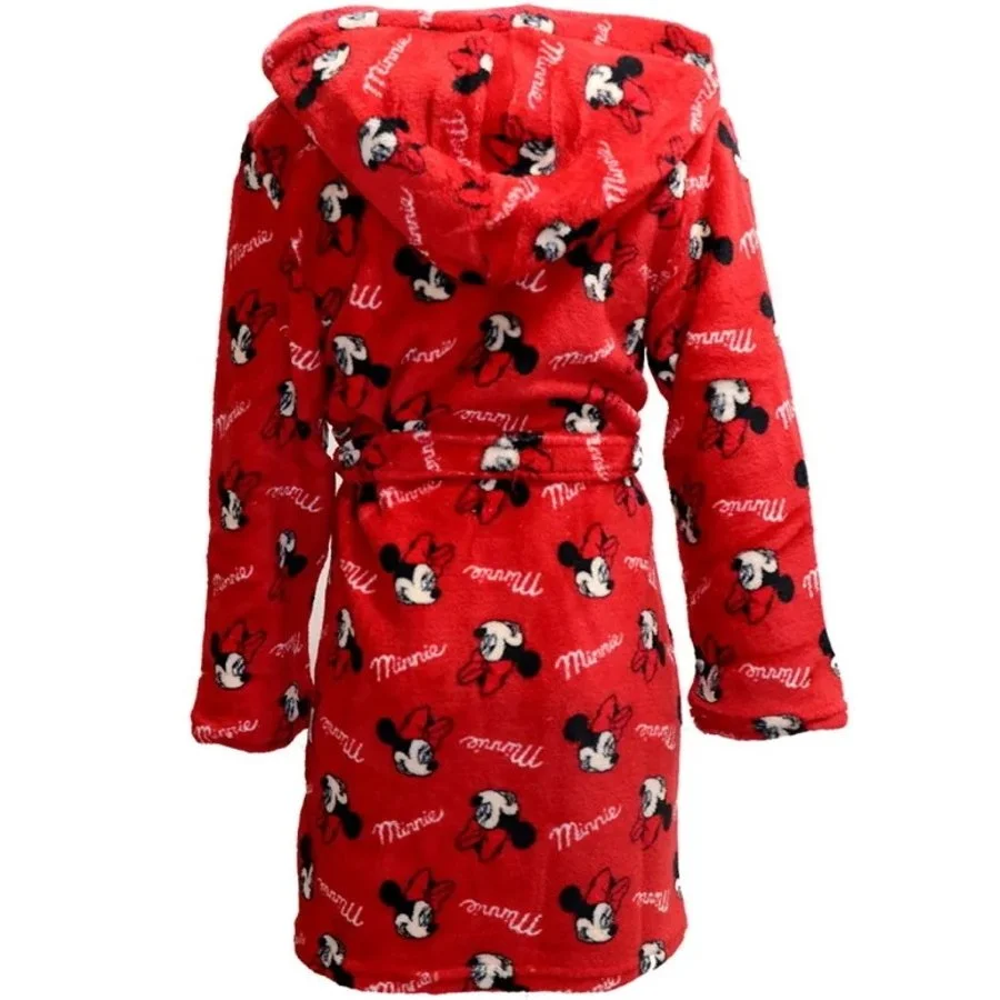 Dětský župánek Minnie Mouse - Disney. Tento dívčí župan je vyrobený z příjemně jemného, chlupatého a hřejivého materiálu Coral fleece s gramáží 240 gr./m2 červené barvy s portréty legendární myšky Minnie a nápisy s jejím jménem. Župan má kapuci a samozřejmě pásek v pase.