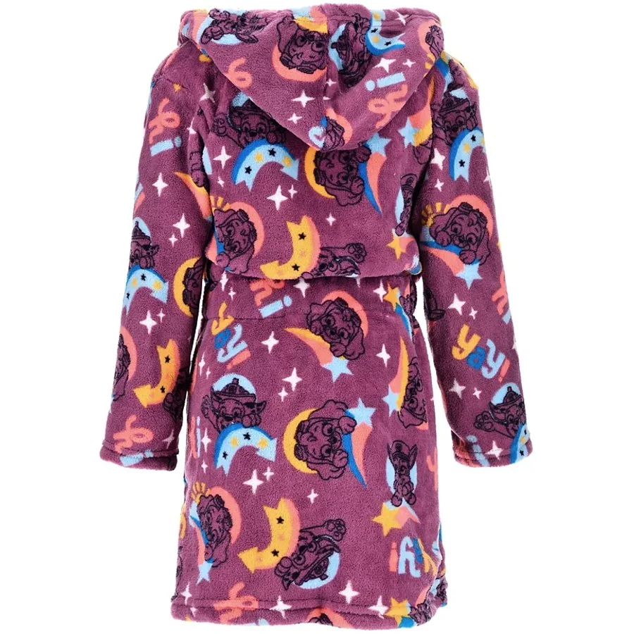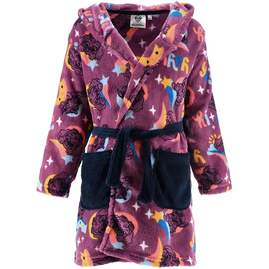 Dětský župánek Tlapková patrola - Paw Patrol. Tento dívčí župan je vyrobený z příjemně jemného a hřejivého sametového coral fleece WellSoft 190 g/m² s obrázky letecké záchranářky Skye, policisty Chase, hvězdičkami a kometami s barevným ohonem. Dodáváme jej v meruňkově růžové, nebo fialové barevné variantě. Župan má kapuci, dvě kapsy a samozřejmě pásek v pase.
