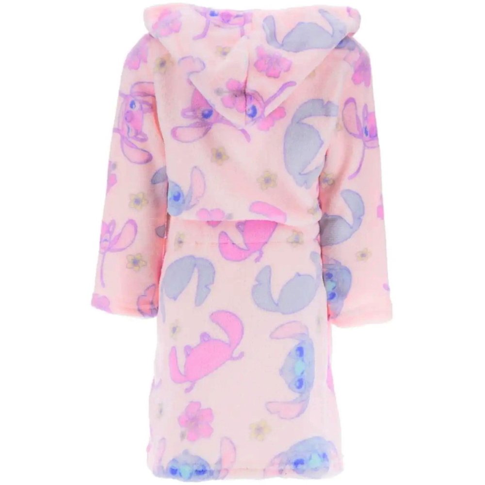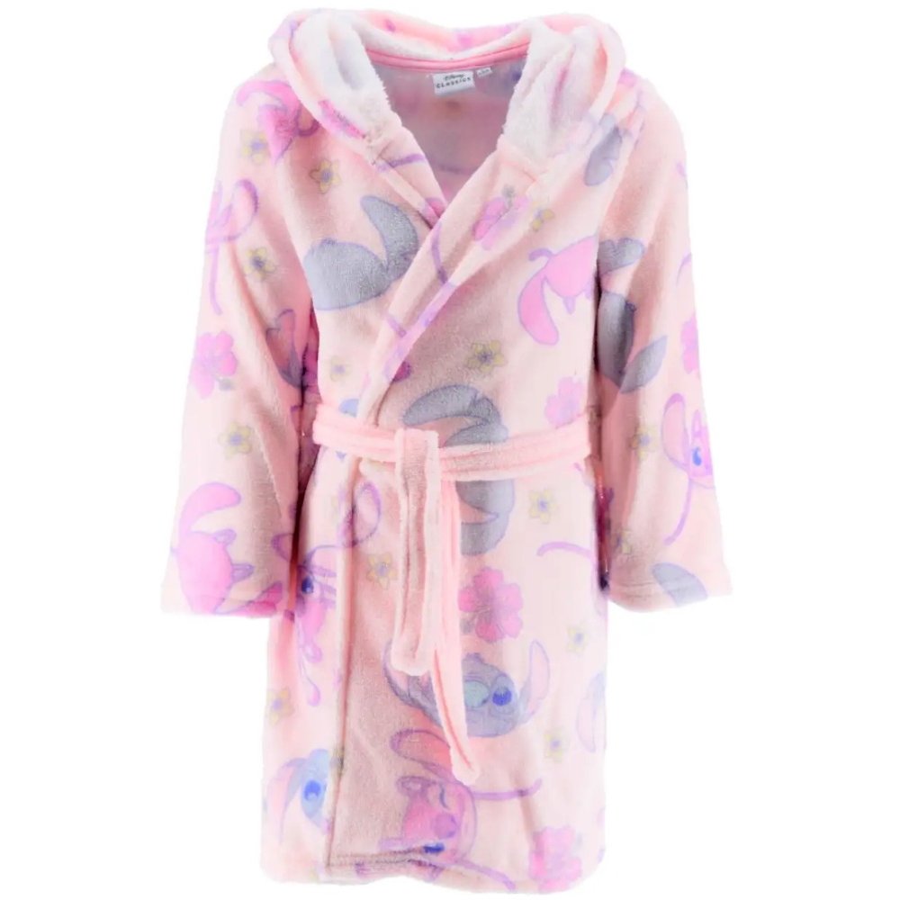 Dětský župánek s kapucí Lilo a Stitch v jemné růžové nebo fialkové barvě. Vyrobený z hebkého flísu 190 g/m² s portréty Stitche a Angel. Dostupný ve velikostech 3A až 8A (EU 98–128).