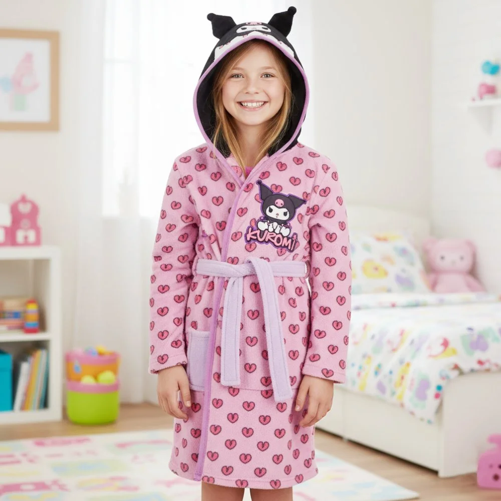 Dětský župánek Kuromi s roztomilým motivem oblíbené postavičky ze světa Sanrio. Je vyrobený z měkkého fleecu s jemným krátkým chloupkem, který je příjemný na dotek. Má kapuci s oušky, jednu kapsu a pásek na zavazování. Dostupný ve velikostech 98–140, tedy pro holky přibližně od 3 do 10 let.