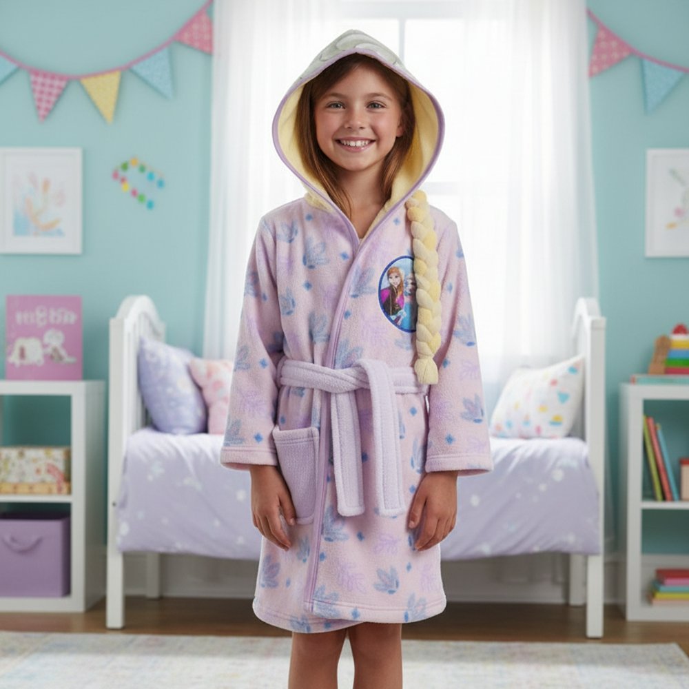 Dětský župánek Frozen s roztomilým motivem princezny Elsy z Ledového království. Je vyrobený z měkkého fleecu s jemným krátkým chloupkem, který je příjemný na dotek. Má kapuci s copem, jednu kapsu a pásek na zavazování. Dostupný ve velikostech 98–140, tedy pro holky přibližně od 3 do 10 let.